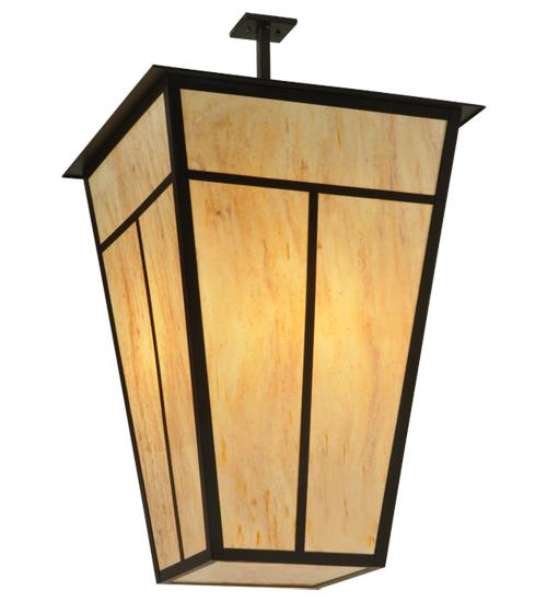 Ideal for large hospitality and commercial lighting applications; this stunning Grand styled ceiling pendant is inspired by the Arts and Crafts movement. The striking straight line fixture design features a Travertine Idalight diffuser; which is complemented with the frame; decorative accents and hardware in a Timeless Bronze finish. The pendant is handcrafted by highly skilled artisans in our 180;000 square foot manufacturing facility in Yorkville; NY. Custom sizes; styles; colors and dimmable energy efficient lamping options such as LED are available. The 36-inch square pendant is UL and cUL listed for damp and dry locations.