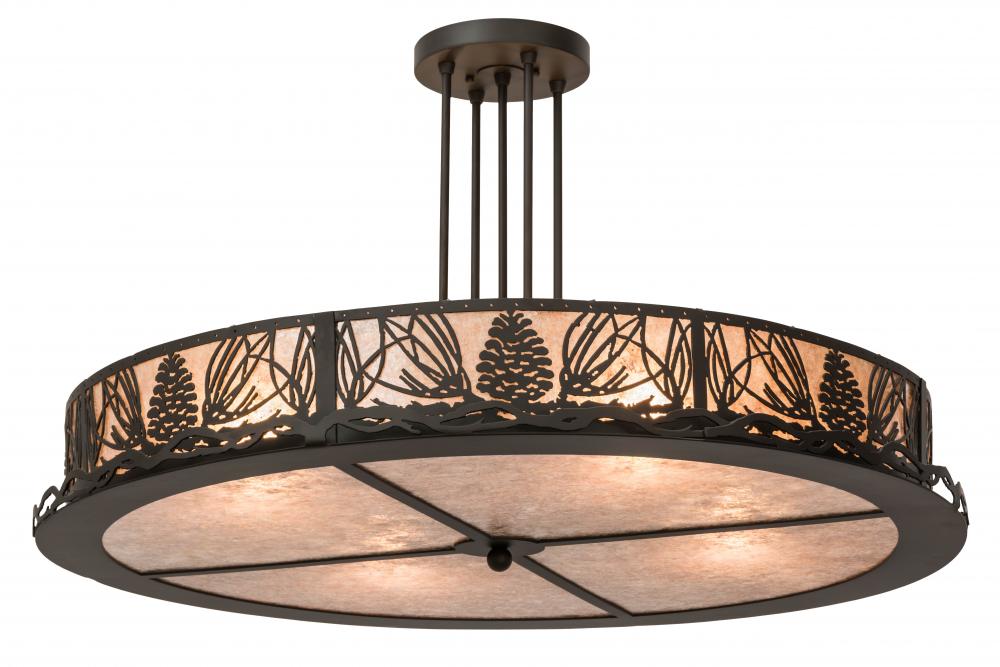 Rustic charm comes alive with beautiful ambient light through a stunning Silver Mica lens with a matching bottom diffuser. This nature inspired fixture is accentuated with Timeless Bronze finished Pinecones and Pine needles for a dramatic look. The breathtaking semi-flushmount is handcrafted by highly skilled artisans in our manufacturing facility at the foothills of the spectacular Adirondack Mountains. Custom designs; sizes and colors are offered. Energy efficient lamping options such as LEDs are available. The fixture is UL and cUL listed for damp and dry locations.