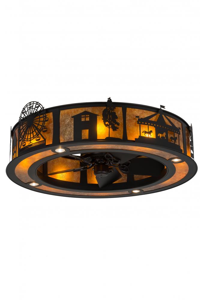 A distinctive; fan-tastic decorating idea for a home; retailer or hospitality location; this dual-function lighting/fan innovation features energy efficient technologies. This delightful modern marvel features various storybook images of Americana; including Ferris Wheel; Carousel; Cowboy Singer; American Home and Harness Racers. 8 inner lights reveal the beauty of the Amber Mica diffuser while 4 downlights deliver functional illumination. This unique ceiling fixture; which is enhanced with a frame; decorative accents and hardware featured in a Textured Black finish; is handcrafted in Yorkville; New York. In summer; the fan pushes down a windchill that circulates to keep the space cool and comfortable. In winter; the fan is reversed to pull the room air up towards the ceiling and force the warm air back down and circulate to create warmth. Custom sizes; styles and colors are available. UL and cUL listed.
