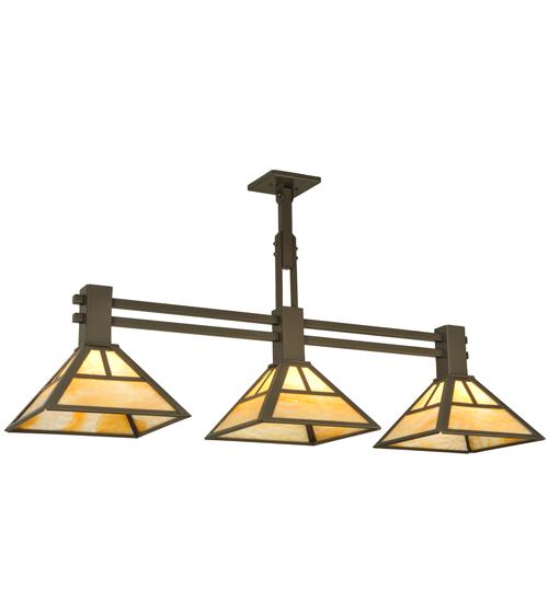 This handsome Craftsman styled Pendant is inspired by the Arts and Crafts movement. This fixture features 3 Beige art glass shades with a striking Mission straight line design and complemented with hardware and decorative accents highlighted in a Timeless Bronze finish. The fixture is ideal for illuminating billiard tables; islands; counters; bars; and tables. The pendant is handcrafted by highly skilled artisans in our 180;000 square foot manufacturing facility. Custom sizes; styles; colors and dimmable energy efficient lamping options are available. The 48-inch wide fixture is UL and cUL listed for dry and damp locations.