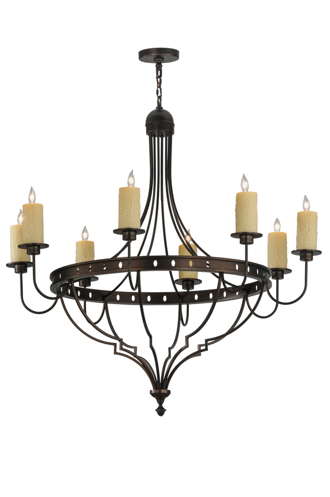 An elegant statement piece of distinction. The Botticini Chandelier features 8 Ivory faux candlelights aligned around the pierced ring which is hand finished in Mahogany Bronze. The overall height ranges from 53 to 112 inches as the chain length can be easily adjusted in the field to accommodate your specific lighting application needs. Handcrafted by highly skilled artisans in our 180;000 square manufacturing facility in Yorkville; New York. Candlelight colors; metal finishes and fixtures sizes can be customized to meet your needs. UL and cUL listed for damp and dry locations.