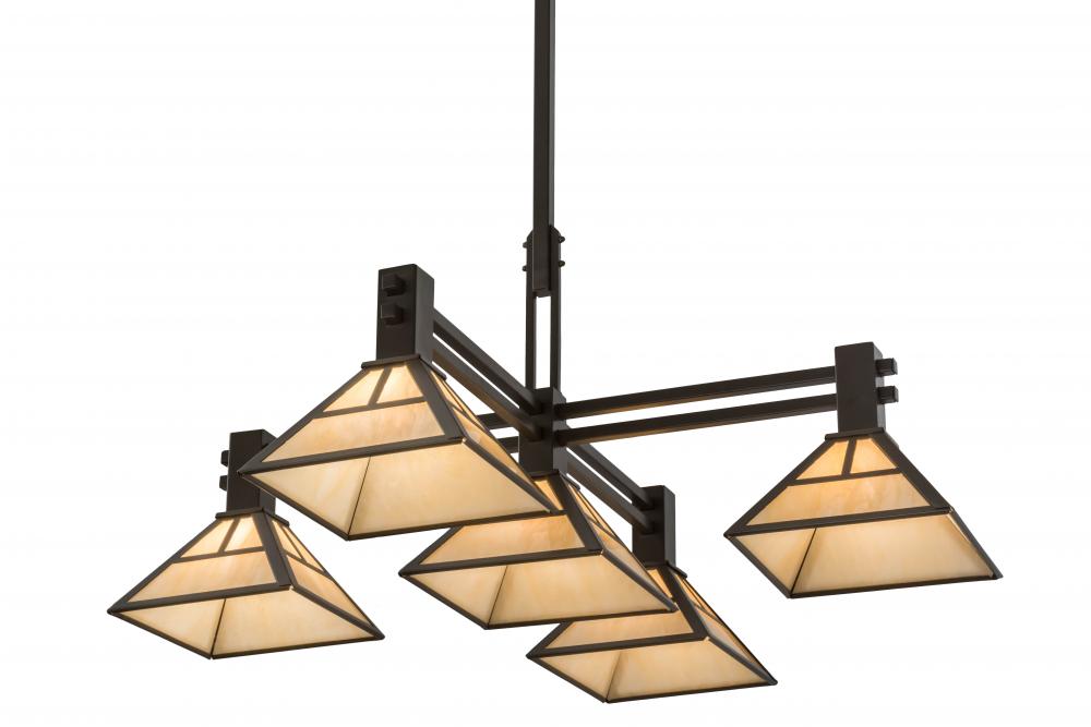 This handsome Craftsman styled Pendant is inspired by the Arts and Crafts movement. This fixture features 5 Sahara Taupe Idalight shades with a striking Mission straight line design and complemented with hardware and decorative accents highlighted in a Timeless Bronze finish. The fixture is perfect for a broad range of interior lighting applications. The pendant is handcrafted by highly skilled artisans in our 180;000 square foot manufacturing facility in Yorkville; New York. Custom sizes; styles; colors and dimmable energy efficient lamping options are available. The 48-inch long fixture is UL and cUL listed for dry and damp locations.