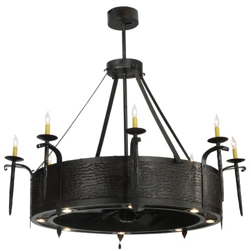 Innovation never looked so good with this breathtaking custom lighting fixture that integrates ceiling fan technology. This rich; handsome design is featured in our award winning Chandel-Air collection. Enjoy beautiful light evoked from a hand hammered steel banded fixture featured in a Costello Black finish; which includes eight faux candlelights for decorative lighting and eight down lights for task lighting. Gentle breezes are produced by the fan spinning quietly in the center. In summer; the fan pushes down a windchill that circulates to keep the space cool and comfortable. In winter; the fan is reversed to pull the room air up towards the ceiling and force the warm air back down and circulate to create warmth.