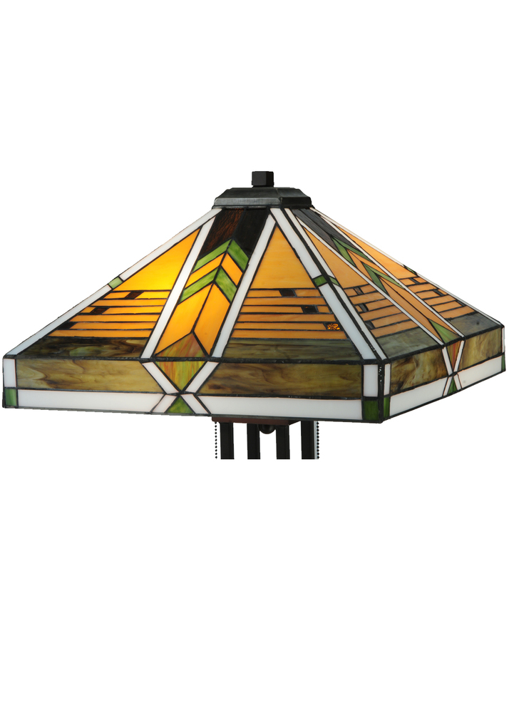 Offering a unique and handsome Mission design; Abilene uses colorful arrowheads of Honey; Woodsy Green and Bark Brown on a multi-designed motif of linear locks of Green; Bark Brown and Amber. The handcrafted stained glass shades; which feature a Mission design that interprets organic objects into geometric forms; are framed in White with Woodsy Green glass and was created using Meyda Tiffany's famous copperfoil construction process. The shade is complemented with Mahogany Bronze finished four-column base.