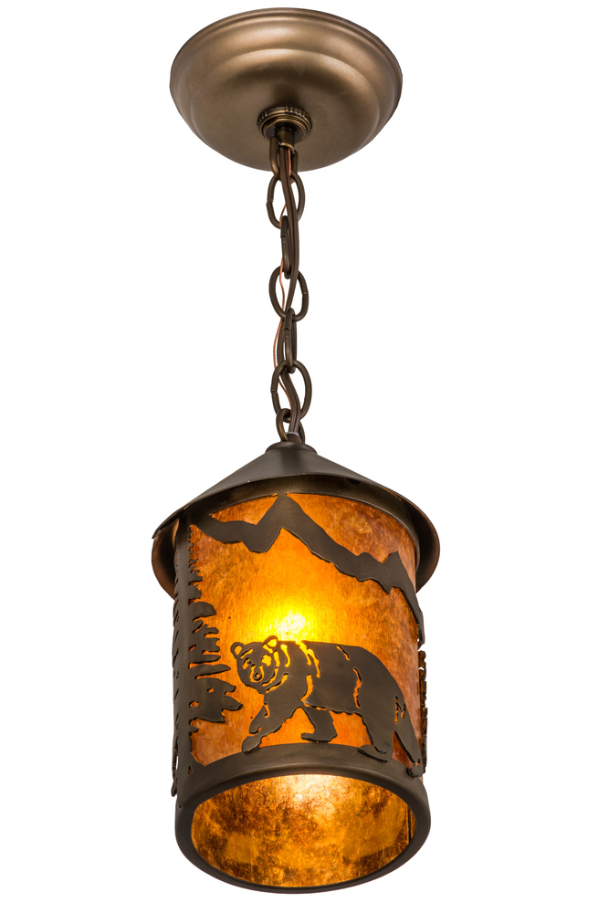 Drawing inspiration from the wildlife and natural beauty in the spectacular Adirondack Mountains. This stunning fixture depicts a bold Bear meandering across the mountainside. Beautiful ambient light is evoked through Amber Mica that is complemented with a frame and hardware featured in an Antique Copper finish. The overall height of this pendant ranges from 14 to 49 inches as the chain length can be easily adjusted in the field to accommodate your specific lighting application needs. Align this mini pendant in multiples to create a design statement over islands; tables; counters; and bars. Handcrafted in our 180;000 square manufacturing facility in Yorkville; NY. UL and cUL listed for dry and damp locations.