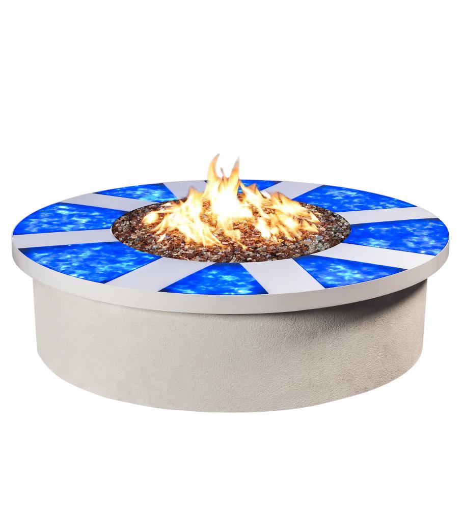 Inspired by gods of fire Vulcan and Hephaestus... The Lakeview Outdoor Fireplace features Meyda Tiffany fused glass that is illuminated by integral LEDs from within. The labor-intensive production included 40 hours of kiln casting time to create each of the 16 multi-dimensional glass tiles. The custom glass tile pattern was commissioned to surround Warming Trends custom ready to finish outdoor gas fire pit kit. The lighted tiles illuminate independently of the Crossfire Burner to create a one of a kind outdoor patio experience. Handmade in our 180;000 square foot manufacturing facility in Yorkville; New York. We can customize outdoor fireplaces to meet your needs.