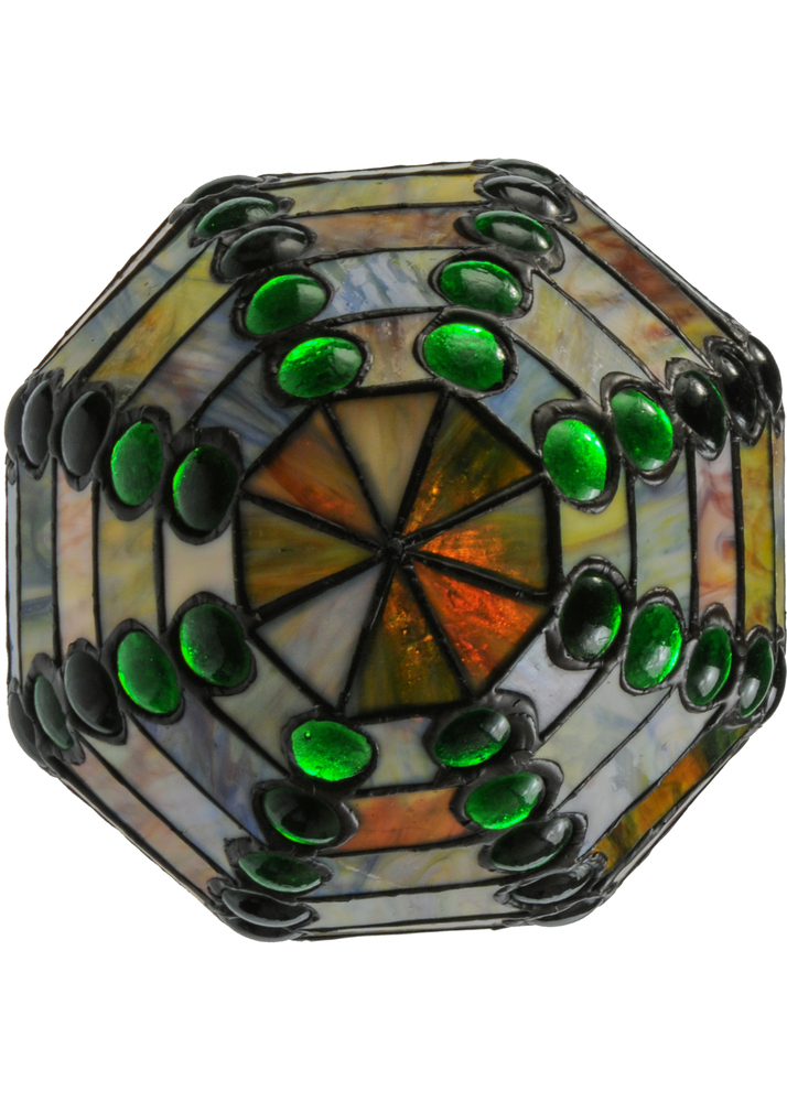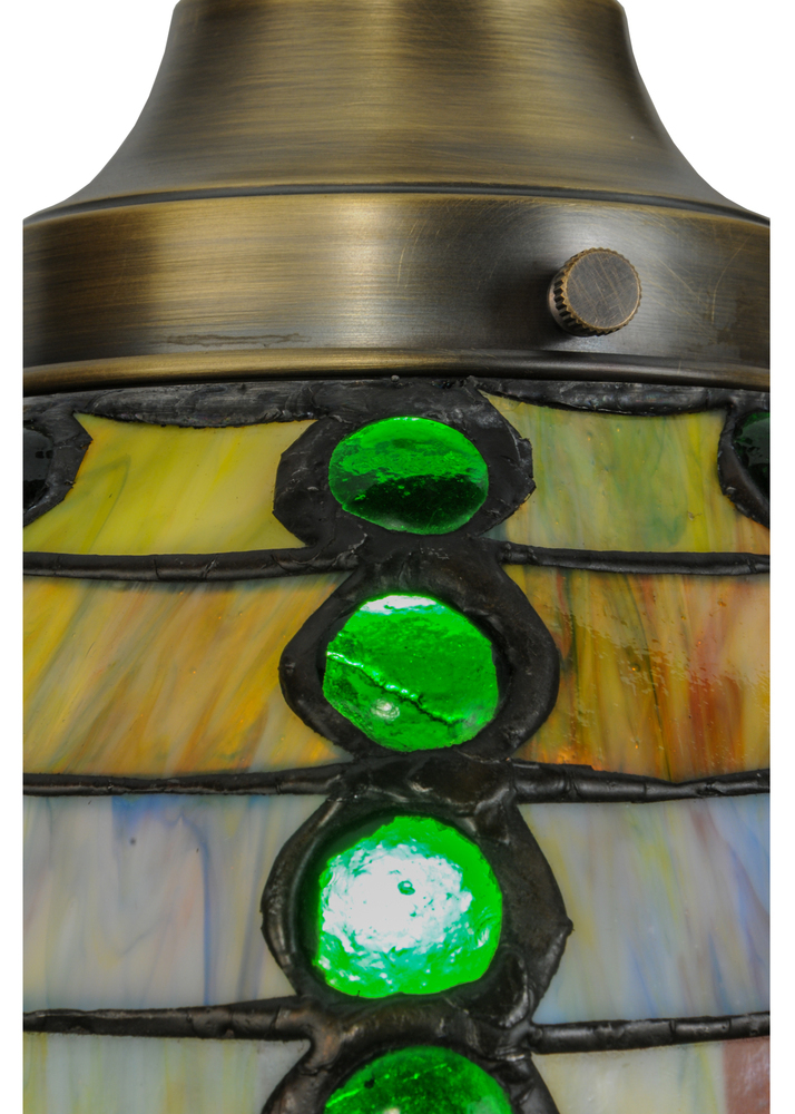 Bedazzling and luxurious define this exquisite mini pendant. Emerald colored glass jewels line this brilliant shade on a background of Earthy Blues; Greens and Amber art glass. The shade is created using the famous Meyda Tiffany copperfoil construction and complemented with a Mahogany Bronze finish. Group several mini pendants to create a stunning design statement above kitchen islands; tables; counters and bars. The Jeweled Beehive Mini Pendant is included in our American designed; handcrafted Stained Glass Lighting Collection. UL and cUL listed for dry and damp locations. No two art glass shades will be the same as their individuality can be as remarkably unique as their personality.