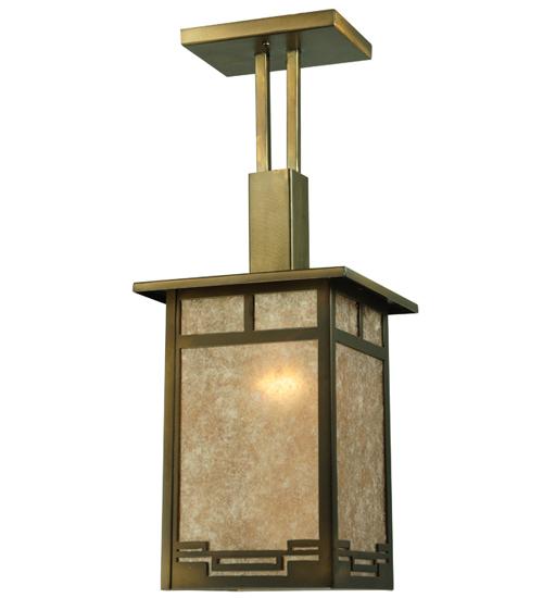 Bring a Bungalow Arts and Crafts look into a home; restaurant; retail store; hotel or commercial setting with this handsome handcrafted pendant; which features a lantern with an elegant geometric trim; framed in Antique Copper finished metal with Silver mica panels. The lantern is suspended from linear hardware in matching Antique Copper finish. This stunning fixture is the perfect complement to almost any decor and is handcrafted in the USA by Meyda artisans. Custom colors; styles and sizes offered. Energy efficient lamping options available. UL Listed for damp locations.