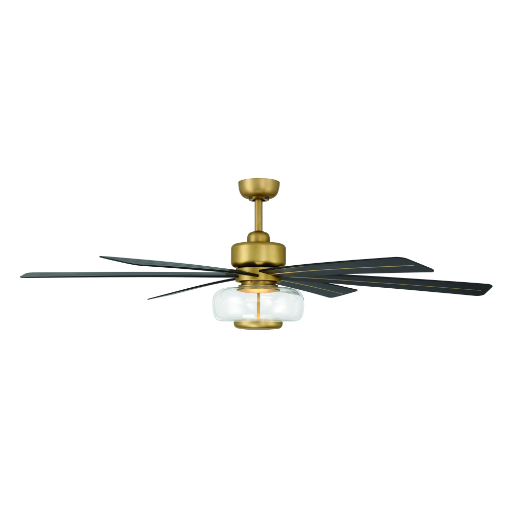 Featuring a Heritage Brass finish with Coal blades and Clear shade.