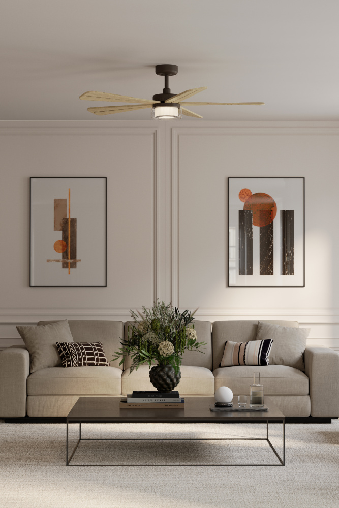 Featuring a Dark Bronze finish with White Oak blades and Clear shade.