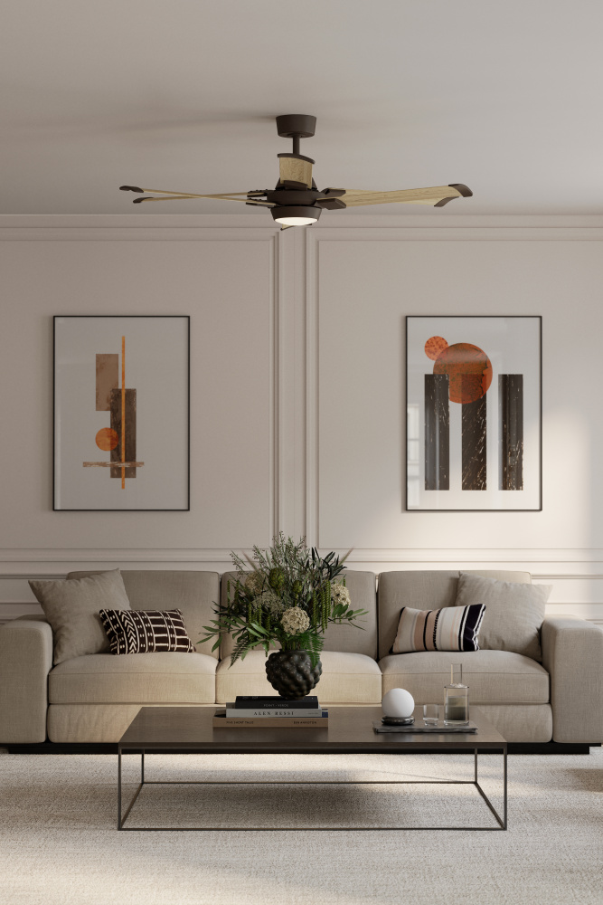 The Soarin ceiling fan pairs high-performance air movement with a streamlined, transitional silhouette.