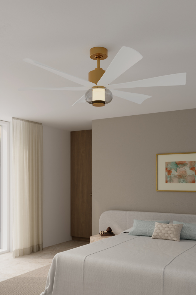 Featuring a Legacy Brass finish with Alabaster White blades and Clear shade.