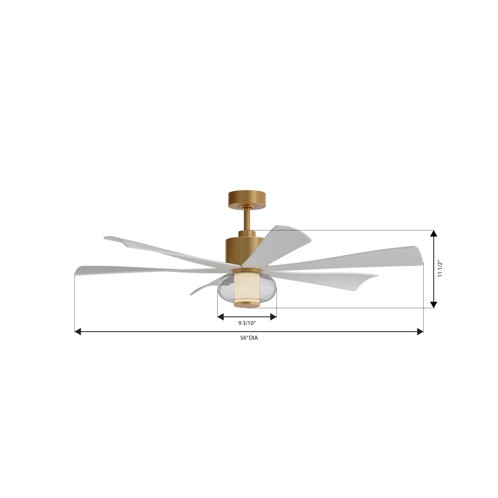This ceiling fan measures 56"L x 56"W x 18.25"H with a 56" blade sweep.
