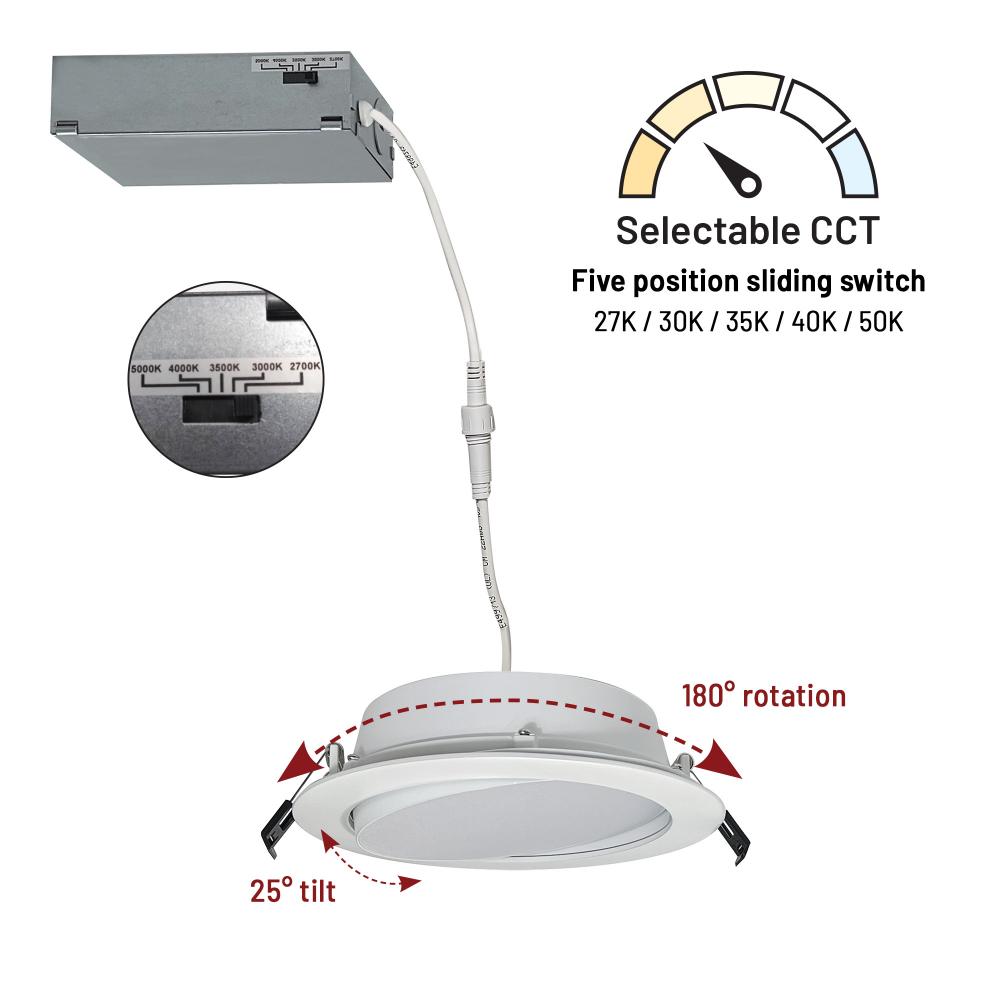 6" FLIN Adjustable LED Downlight with Selectable CCT, 1100lm / 13W, Matte Powder White finish