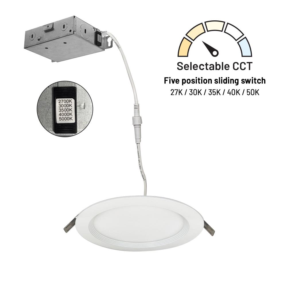 6" FLIN Round Wafer LED Downlight with Selectable CCT, 1300lm / 13.5W, Matte Powder White Finish