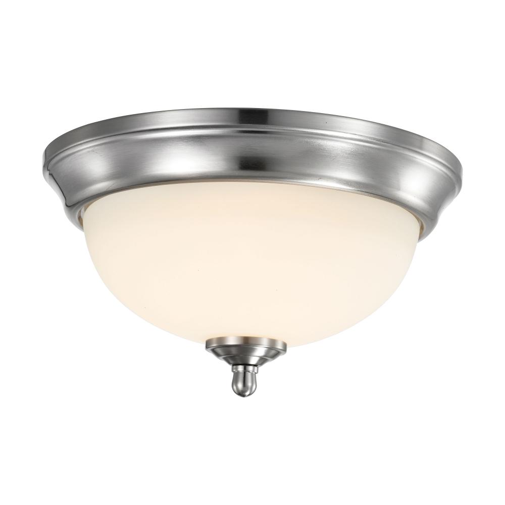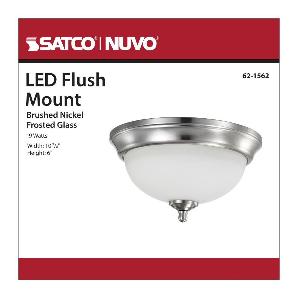 Satco's 62-1562 19-watt, 11 inch flush mount fixture is a clean and traditional lighting solution for the home. The brushed nickel finish and frosted glass are in keeping with the versatile, yet stylish design. Ideal for lighting areas with low ceiling