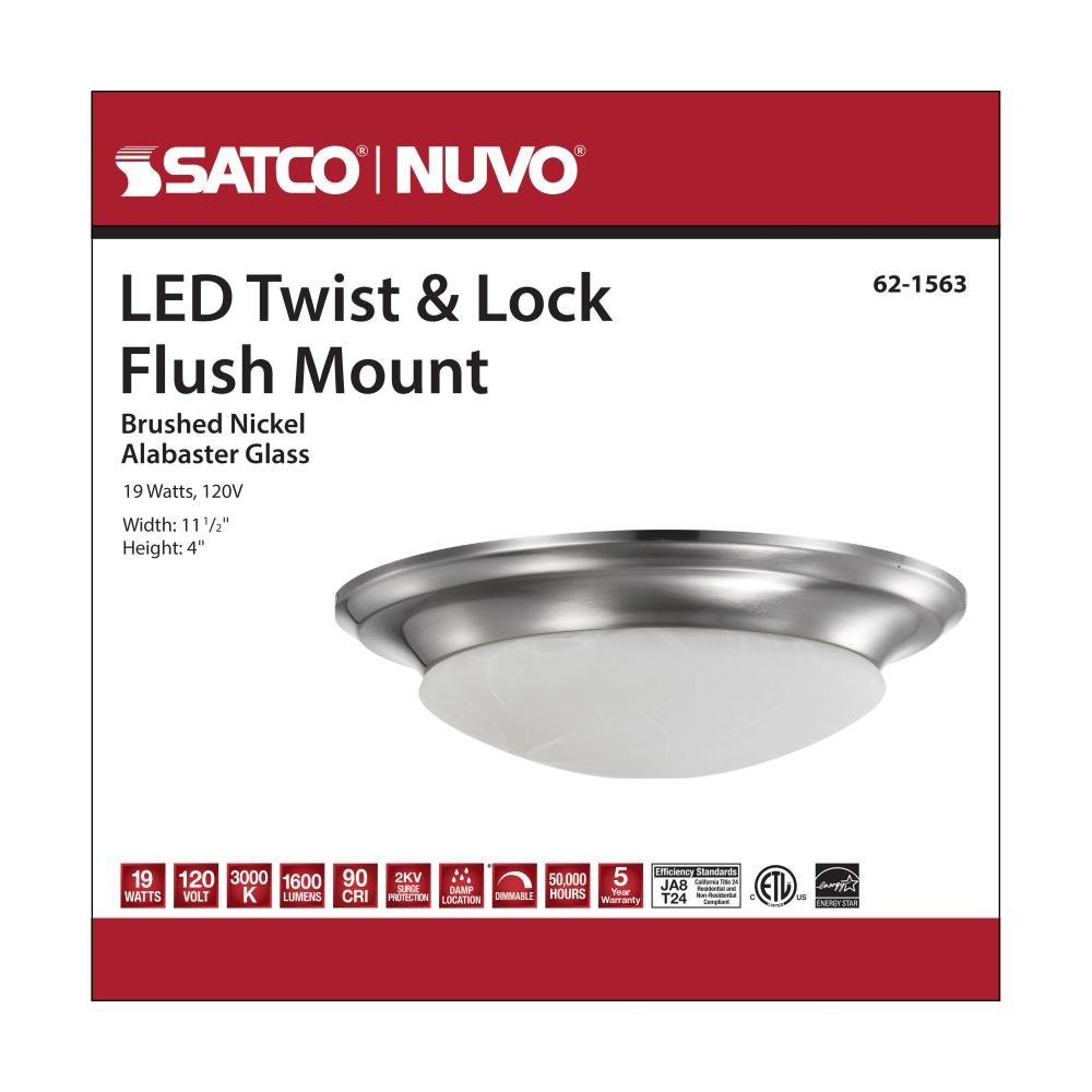 Satco's 62-1563 19-watt, 11 inch, twist and lock flush mount fixture is a clean and traditional lighting solution for the home. The brushed nickel finish and frosted glass are in keeping with the versatile, yet stylish design. Suitable for a variety of