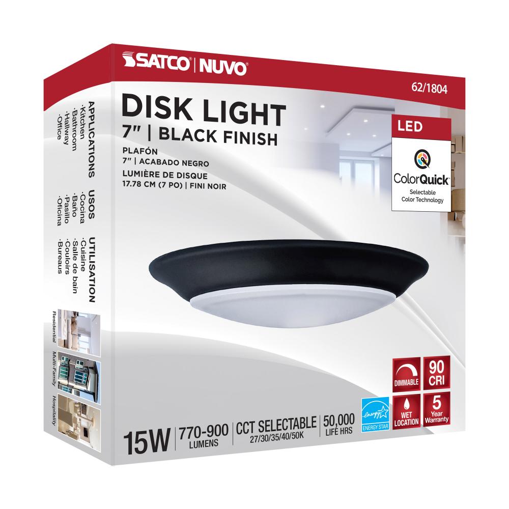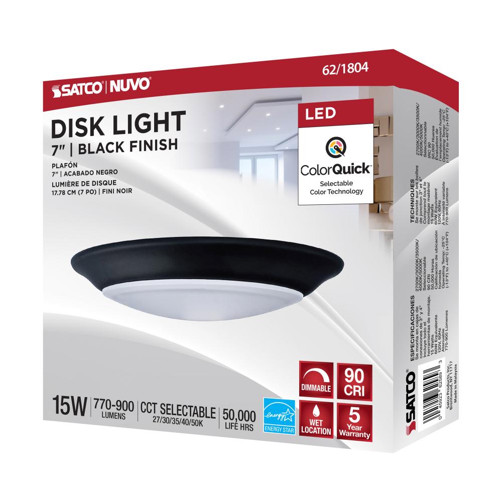 Introducing SATCO NUVO's 62-1804 LED CCT Selectable Disk Light with ColorQuick technology! This 7-inch, 15-watt disk light in black features a high CRI of 93, 2.5kV surge protection, and wet location rating. This CCT Selectable Disk Light is rated for