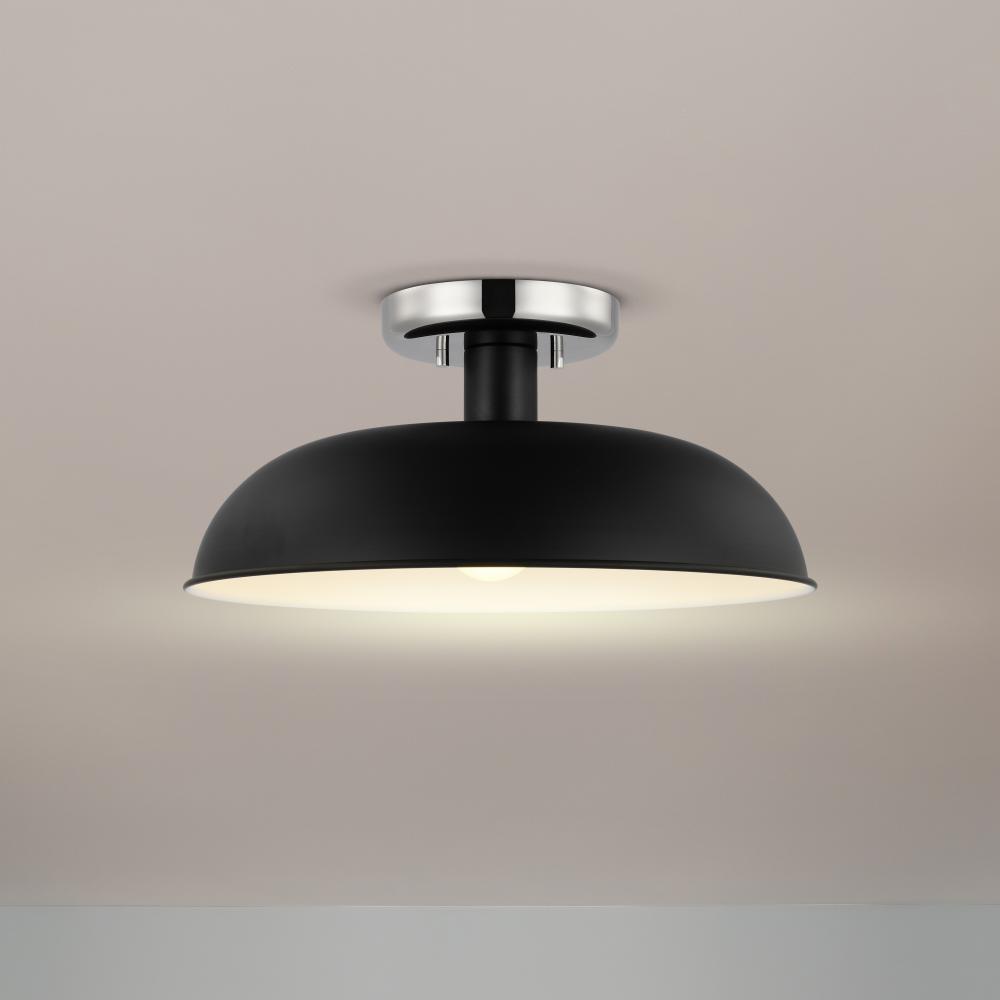 Designed with neutral, clean lines, the Colony small semi-flush is ideal for an eat-in kitchen, entryway, hallway and even a bedroom. The loft-style shallow pan metal shade is done in matte black, with a white interior to reflect the downfacing lamp. The p