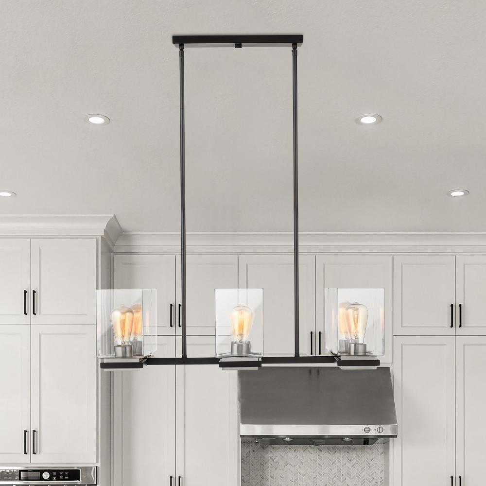 A combination of glass and metal comes together to create the stunning design of the Crossroad island light. The square, clear glass shades showcases the bulbs. The sockets and base are finished in brushed nickel to contrast beautifully with the matte blac
