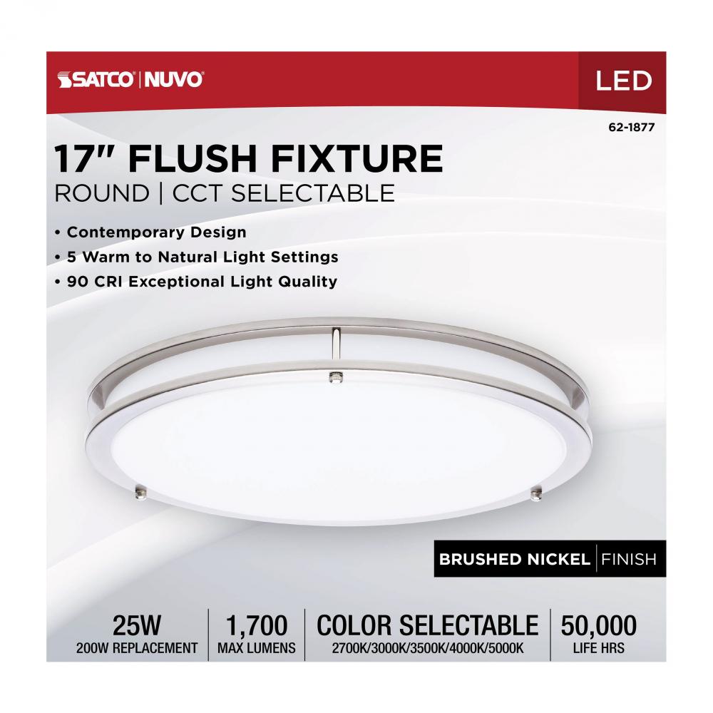 The SATCO NUVO 62-1877 Glamour 17-inch Round Flush Mount in Brushed Nickel delivers sleek, modern lighting with 5 CCT selectable technology (2700K–5000K) and 90 CRI illumination for enhanced color rendering. This 25-watt fixture replaces 200W incandescen