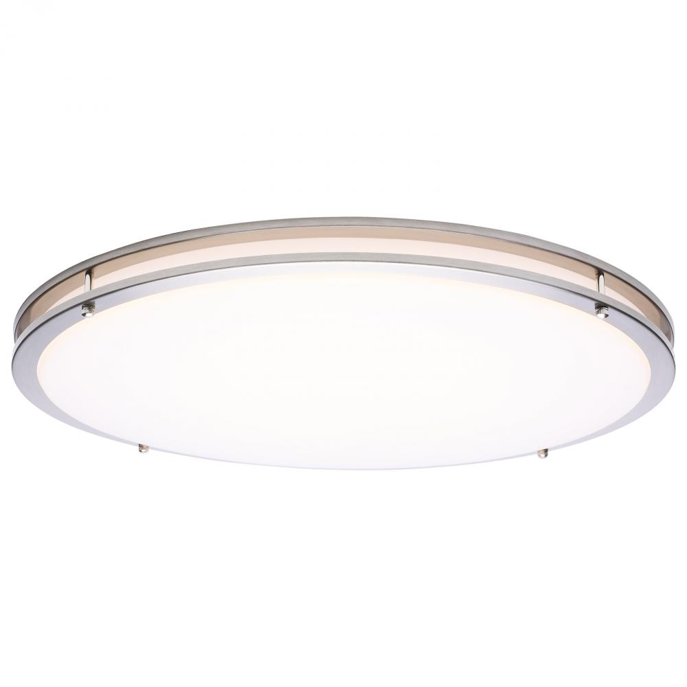 The SATCO NUVO 62-1878 Glamour 24-inch Round Flush Mount in Brushed Nickel delivers sleek, modern lighting with 5 CCT selectable technology (2700K–5000K) and 90 CRI illumination for enhanced color rendering. This 39-watt fixture replaces 250W incandescen