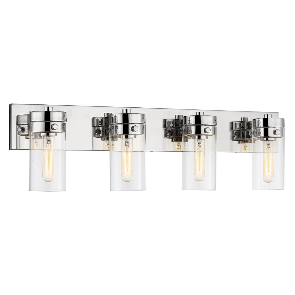 The blend of styles (modern, industrial and chic) is incorporated beautifully into the design of the Intersection 60-7634 four-light vanity fixture. The cylindrical clear glass shades showcase vintage filament bulbs for a touch of nostalgia. The sleek, mir