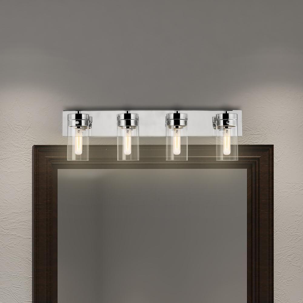 The blend of styles (modern, industrial and chic) is incorporated beautifully into the design of the Intersection four-light vanity fixture. The cylindrical clear glass shades showcase vintage filament bulbs for a touch of nostalgia. The sleek, mirror-like