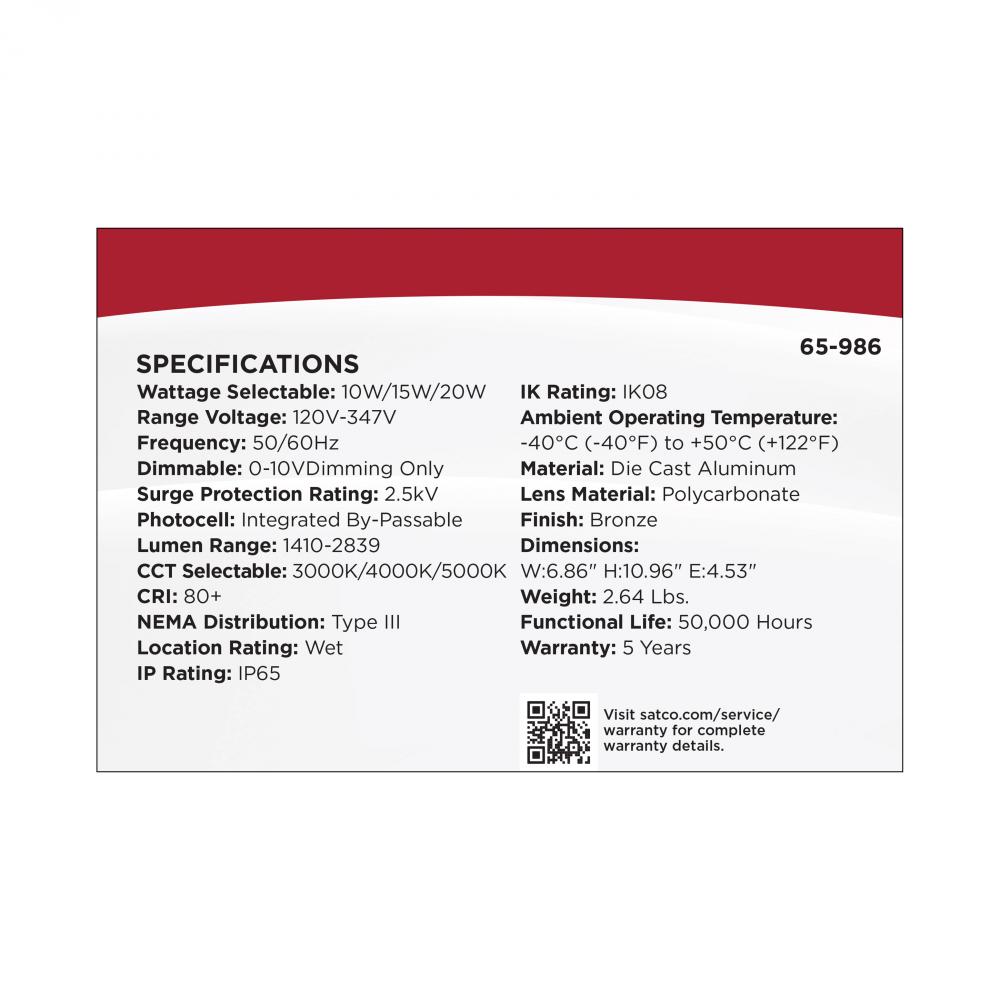 LED Entryway Wall Pack; 10/15/20 Wattage Selectable; 30K/40K/50K CCT Selectable; Bronze Finish