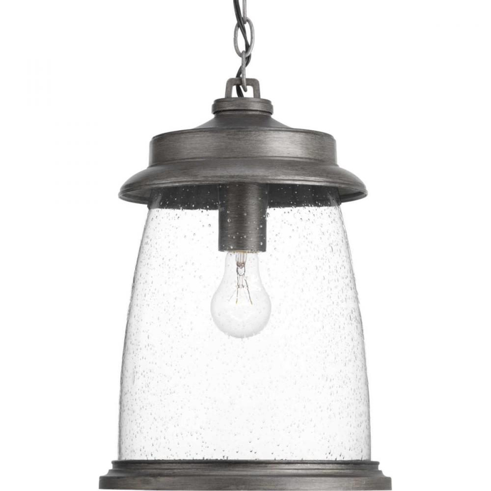 Conover is an outdoor lantern collection featuring nautical influences. A protective die cast ring surrounds beautiful clear seeded glass. Vintage metallic finishes are available for this collection that is sure to enhance curb appeal for a variety of exteriors. Hanging Lantern in a Antique Pewter finish.