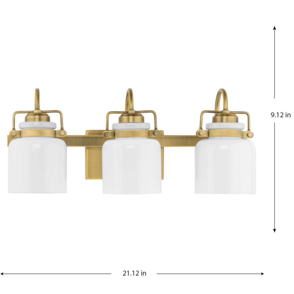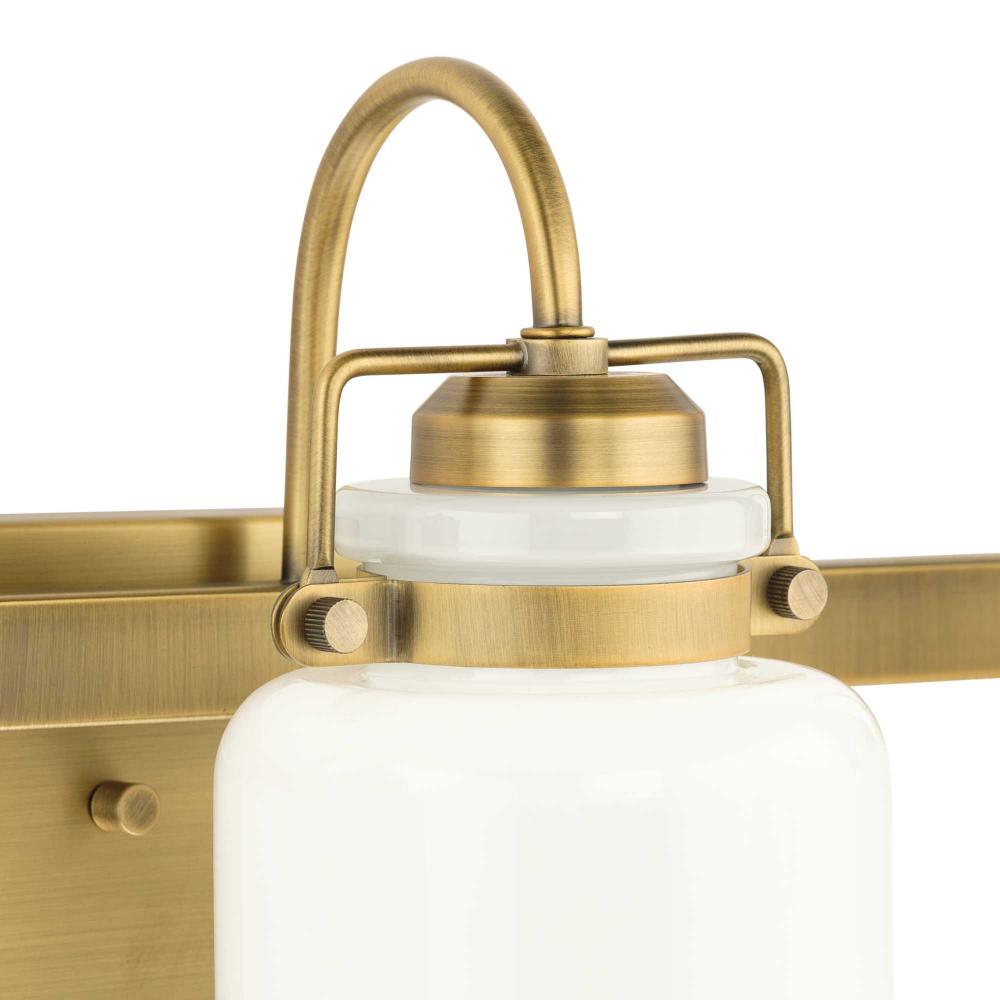 Distinctive mechanical details establish a nostalgic flair in the elegant Fessler collection. Opal glass shades deliver comfortable diffuse illumination to bathrooms and powder rooms in transitional and farmhouse settings. The decorative frame is coated in a stately vintage brass and features authentically crafted hardware elements that complements the curved opal shades. This versatile fixture can be mounted up or down, increasing its design flexibility. It is cULus damp location listed, with a one-year warranty to guarantee your complete satisfaction. Progress Lighting products are designed for exceptional quality, reliability, and functionality. .