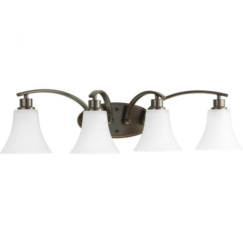Gleeful simplicity defines the Joy Collection. Refreshing and fashionable, arcing forms of metal and fluted glass shades are enhanced by a classic Antique Bronze finish. Four-light fixture with white etched glass complete the look and allows you to coordinate well with other fixtures from this collection. Bring joy into your heart and into your home with this wonderful four-light bath fixture.