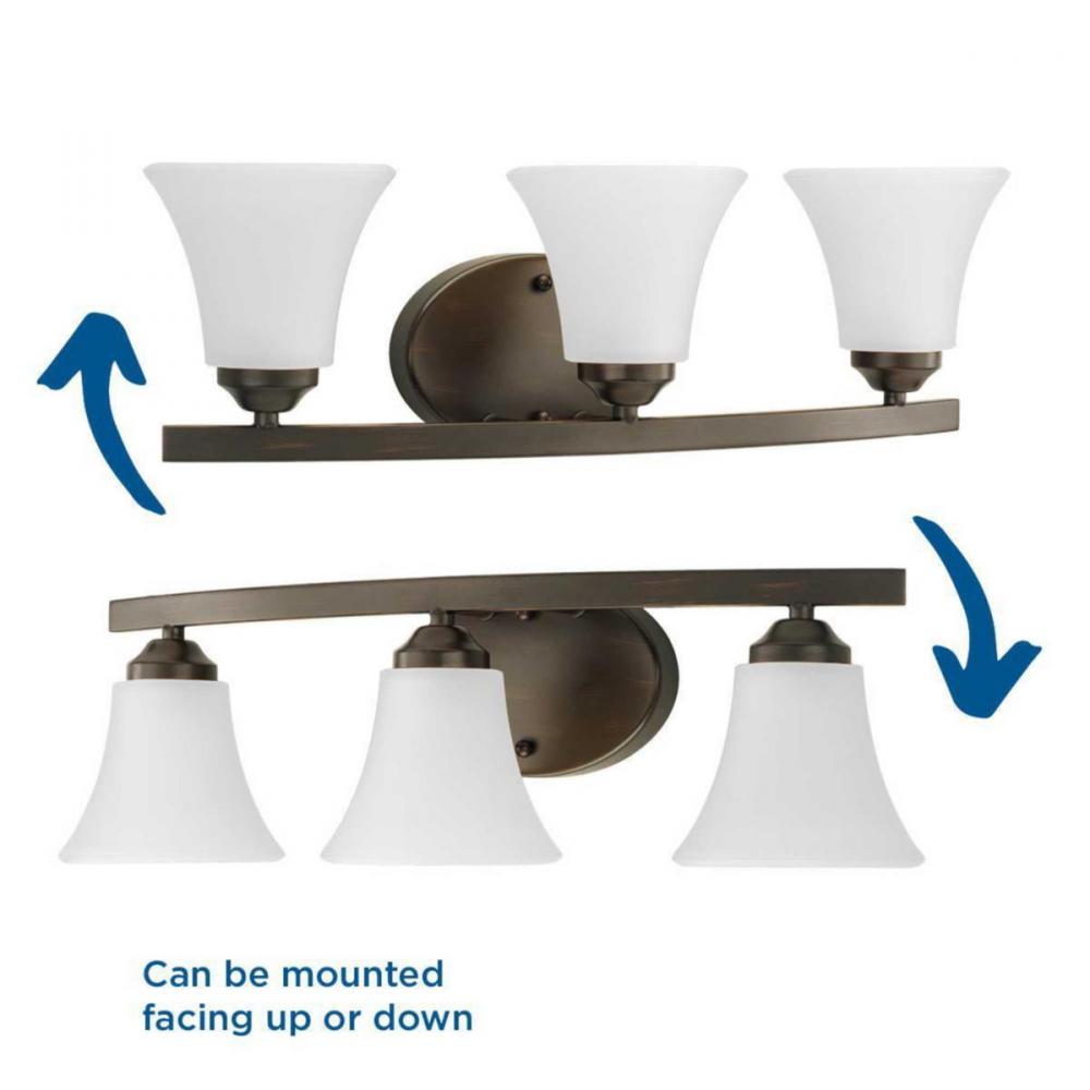 Ideal for a bathroom;Perfect for traditional and transitional style settings;Handsome antique bronze finish;Elegant etched glass shades;Mount the light fixture facing up or down;Use 3 medium base bulbs that are sold separately (100 W max - LED/CFL/incandes