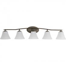 Five-light bath finished in Brushed Nickel with etched glass shades scaled across a slightly arching, pointed arm. Generously balanced glass shades add distinction and provide pleasing illumination to your room. Coordinating fixtures from this collection let you decorate an entire home with confidence and style.