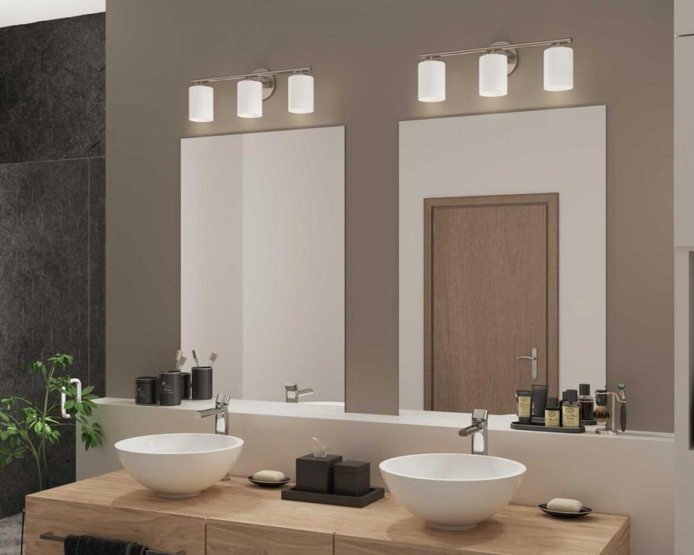 Ideal for a bathroom;Perfect for modern and transitional style settings;Subtle polished nickel finish;Elegant etched painted white glass shades;Mount the light fixture facing up or down;Use 3 medium base bulbs that are sold separately (100 W max - LED/CFL/