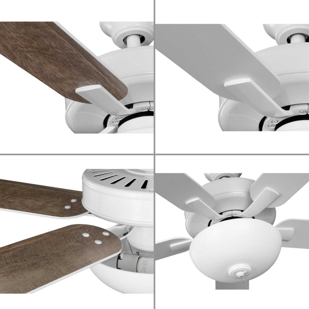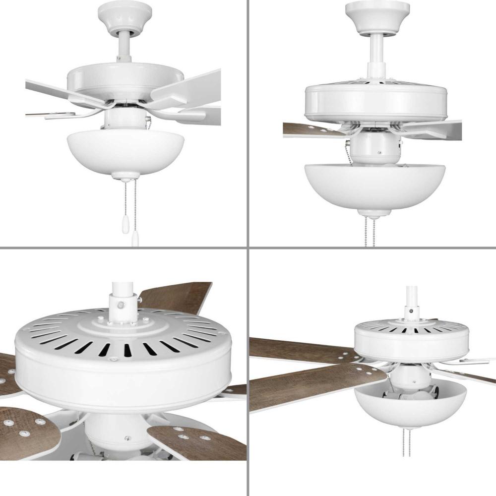 The AirPro 52” 5-blade ceiling fan refreshes interiors with a sleek, modern form coated in a crisp White finish. Five clean-lined fan blades extend outward from a streamlined motor housing that contains a powerful AC motor. Its versatile yet timeless design makes it ideal for a wide range of interior décor styles. The fan has an AC motor and is rated for maximum efficiency. A Unipack option packages the light kit so that it ships with the fan, eliminating both the need to order the light kit separately and having the light kit shipped separately from the fan. A shatterproof white Frosted polypropylene dome shade offers durability and optimal, even illumination. Two medium based LED lamps (8.5-Watt, 80CRI, 3000K) are included. An accessory wall and remote control can be added (sold separately). The fan can be installed on a flat or sloped ceiling. The blade arms have Captive Screws allowing for easier installation.