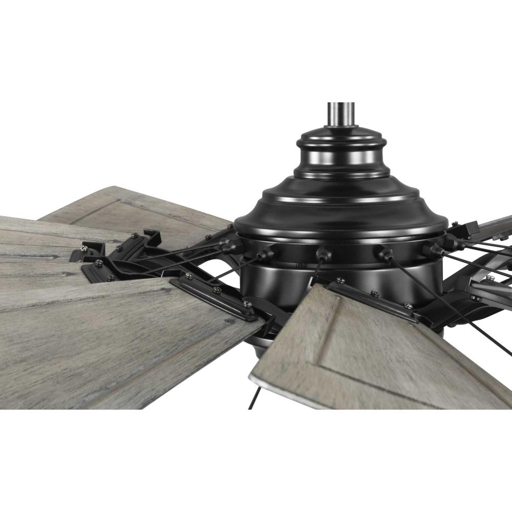 Relax under the refreshing breeze of the Springer Collection 60-Inch Windmill Ceiling Fan. Its large scale and windmill-style blades make it ideal for any great room, bedroom, living room, or bonus room in modern farmhouse, rustic, and coastal-style settings. Its twelve sweeping blades are coated in Distressed Charcoal finish with a Matte Black housing for a rustic flair. Its cULus damp rating makes this lovely fan ideal for use inside or in outdoor covered areas. A 6 speed full-function remote control and wall bracket are included. .