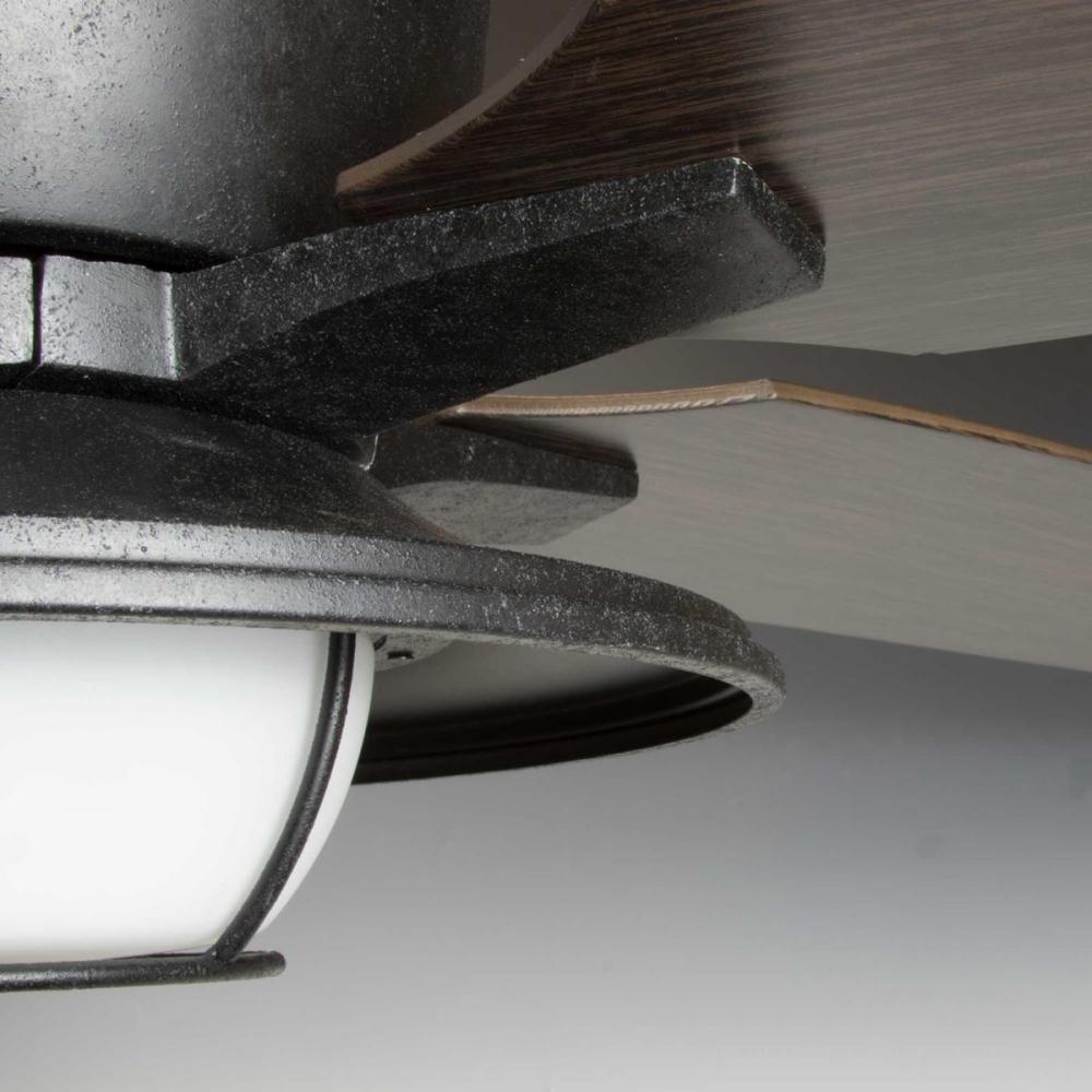This five-blade 60 inch Forged Black with toasted oak blades Montague ceiling fan features an all weather wet location rating (ABS) to accommodate a variety of interior and exterior locations. The white opal glass shade contains a 17W dimmable, 3000K LED module, offering both form and function with energy- and cost-savings benefits. A remote with batteries is included. The Montague features a dual mount system to offer greater flexibility when installing.