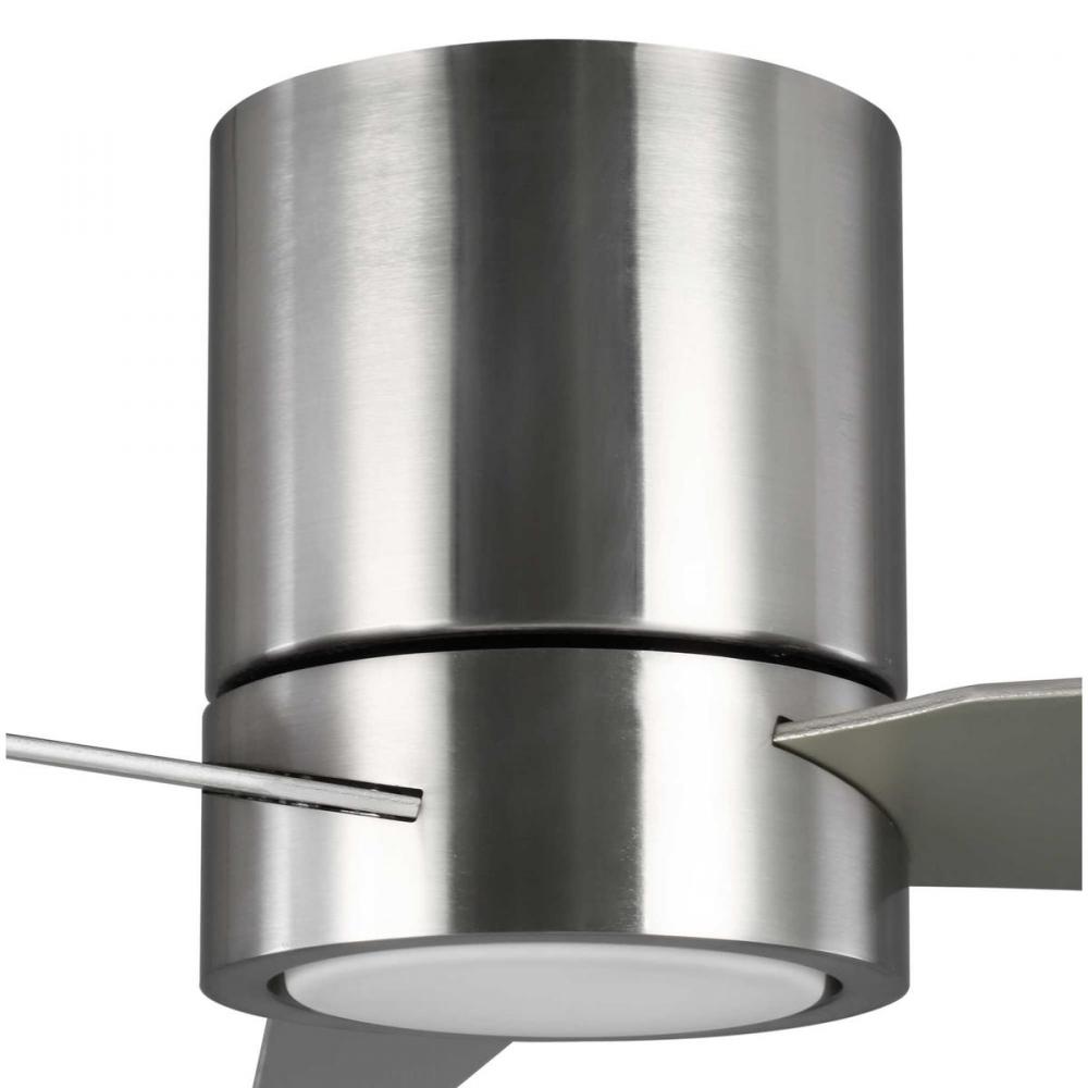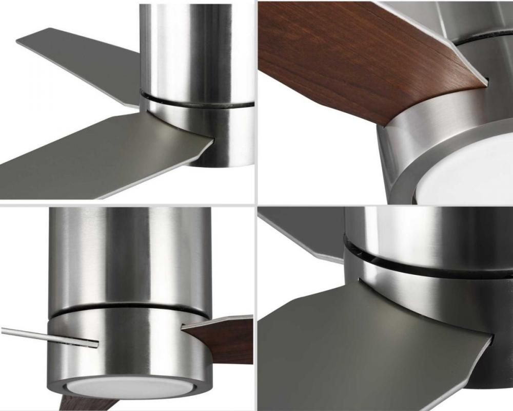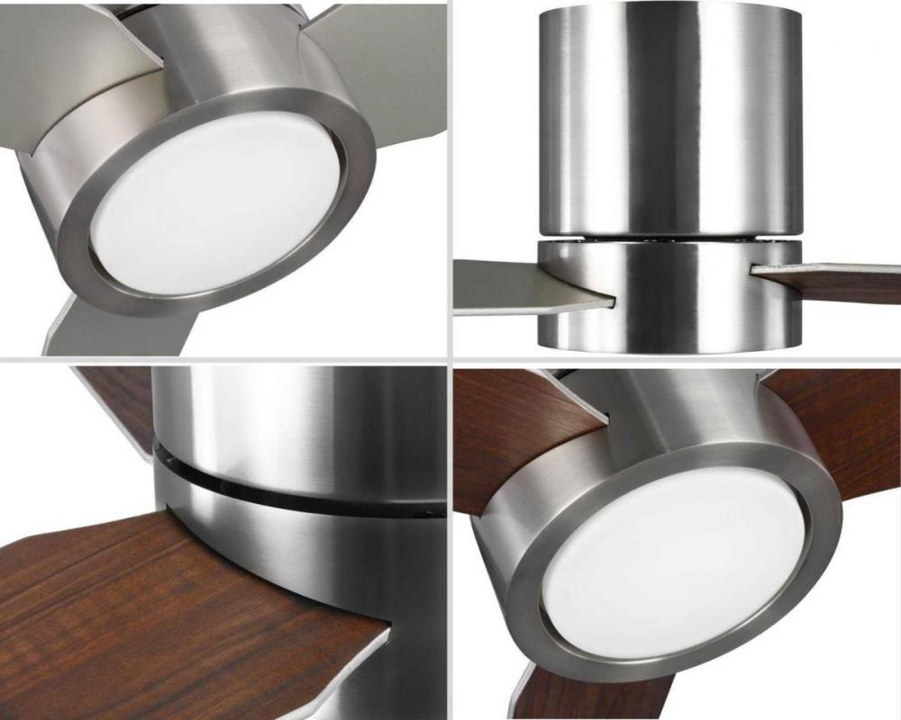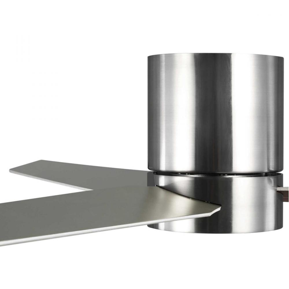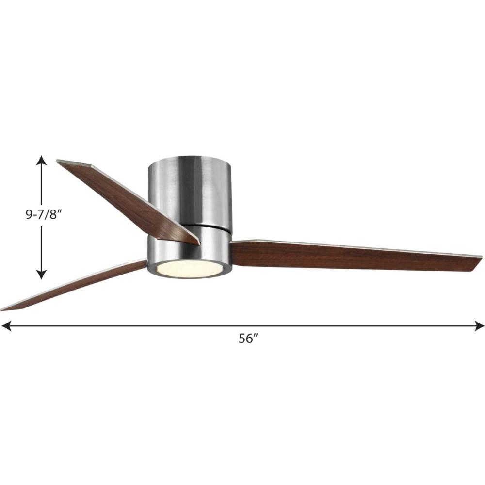 This Braden 56 inch, three-blade, hugger-style ceiling fan features clean lines and a design that complements modern interiors. A shatterproof white opal glass shade contains an integrated 18W LED module, offering both form and function with energy and cost-savings benefits. Featuring a larger motor, Braden moves more air than a traditional hugger ceiling fan. A full function remote with batteries is included. Brushed Nickel finish.