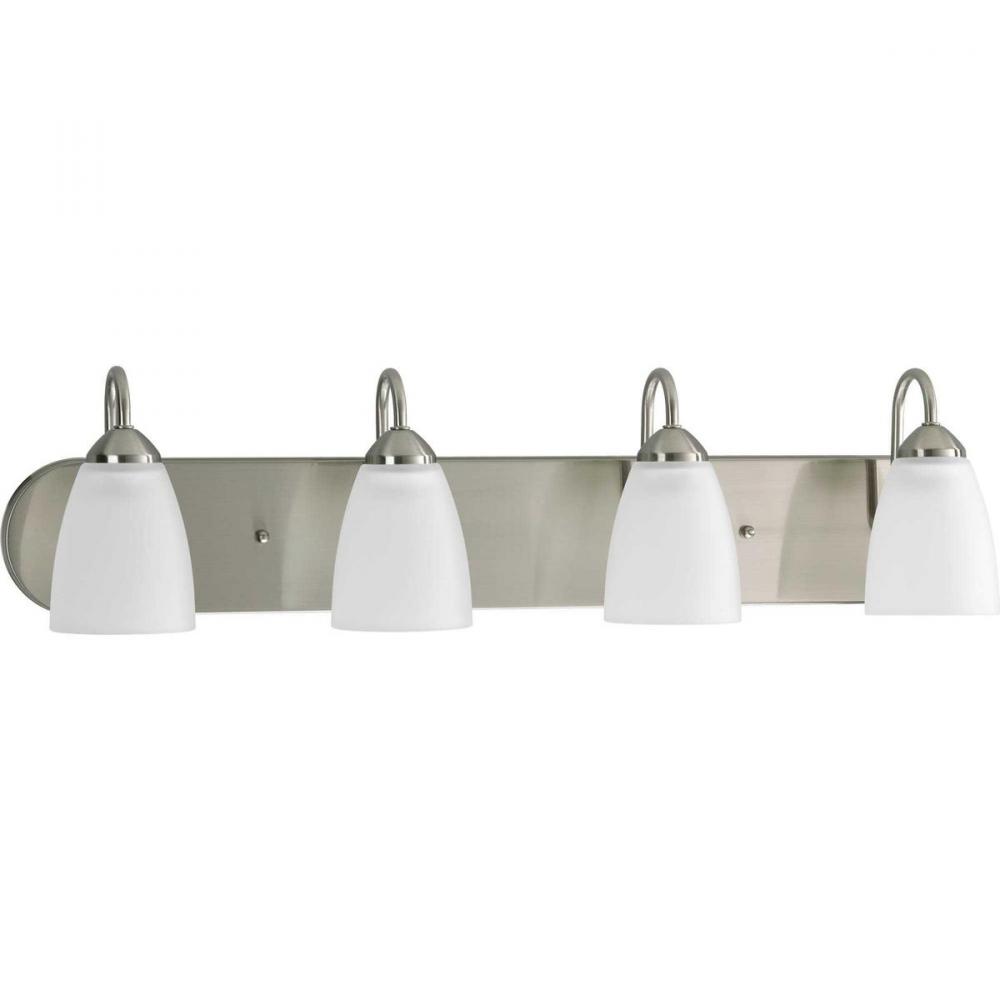 Gather possesses a smart simplicity to complement today's home. This four-light bath bracket contains etched glass shades which add distinction and provide pleasing illumination to your room. Featuring a glamorous Brushed Nickel finished frame, this collection allows you to decorate an entire home with confidence and style.