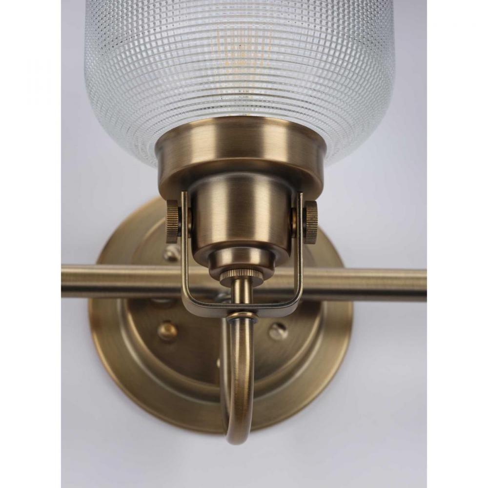 Create a vintage-inspired look by adding the Archie three-light bath to a bathroom or dressing table mirror, in a hallway, or wherever task light is needed. Its softly muted, Vintage Brass finish gives an elegant old-age feel to the circular backplate and curved arms that daintily hold the double, prismatic glass shades. The charming fixture is an excellent selection for farmhouse and transitional settings.