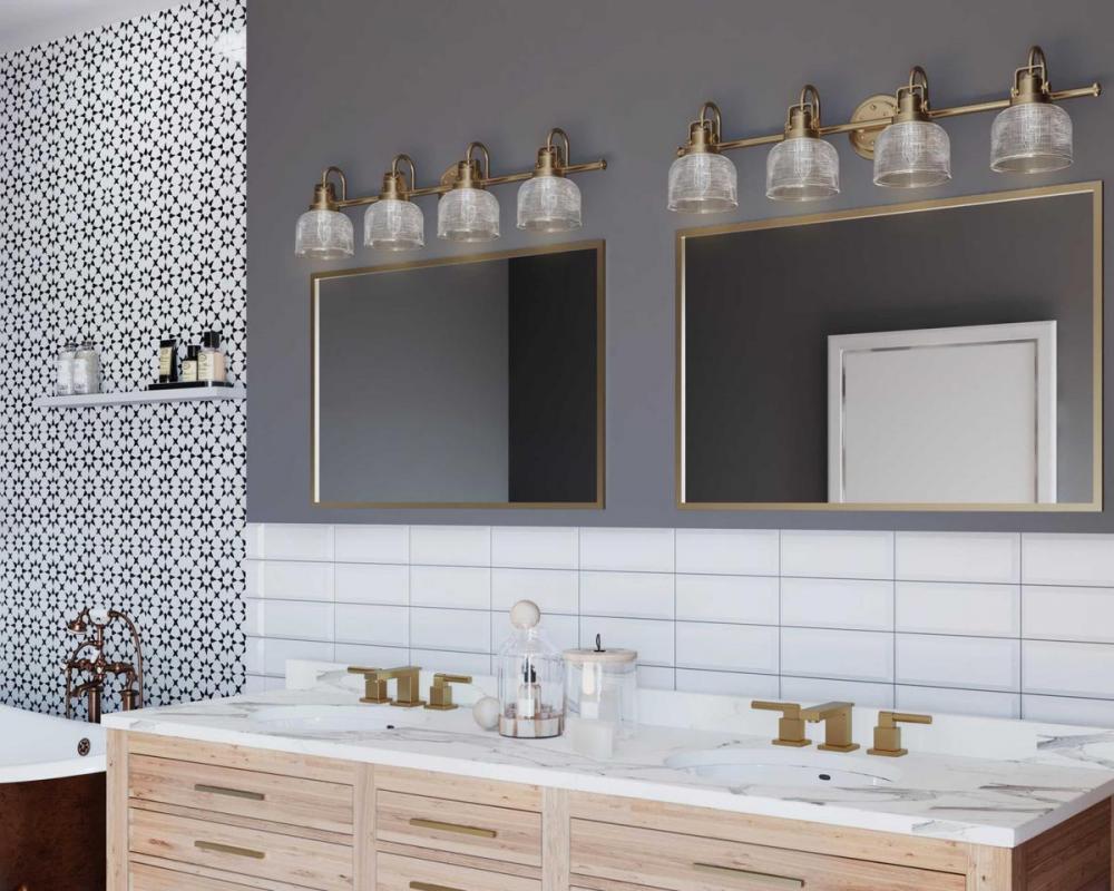 Opt for stronger focused light illumination with the impressive Archie four-light bath. Four refined, double-prismatic glass shades hang shoulder to shoulder, each supported by its own curved arm. A single, straight bar supports the light sources and fuses the entire structure to a circular backplate. With its Vintage Brass finish, the fixture is perfect for inspiring an old-world feel as it brightens a bathroom or dressing table mirror, a hallway, or wherever focused light is called upon in farmhouse and transitional interiors.
