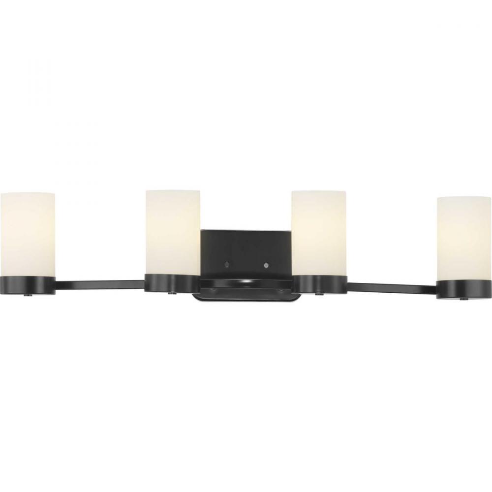Achieve a Modern look with the Elevate Collection four-light bath and vanity. Etched glass white shades provide a striking contrast to the Matte Black finish. Fixtures can be installed with glass facing up or down for added customization.