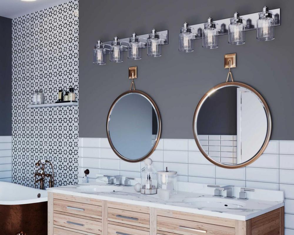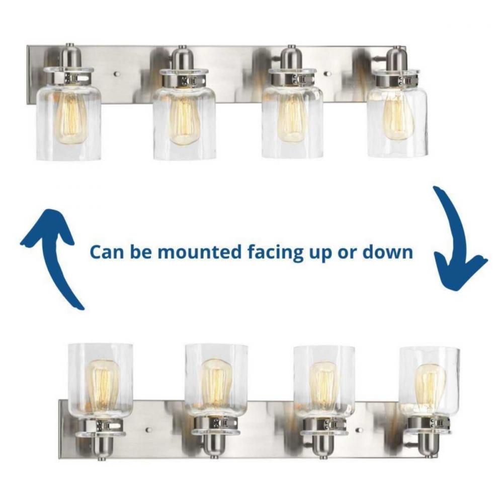 Ideal for a bathroom;Perfect for farmhouse and urban industrial style settings;Beautiful brushed nickel finish;Crisp clear glass shades;Mount the light fixture facing up or down;Use 4 medium base bulbs that are sold separately (100 W max - LED/CFL/incandes
