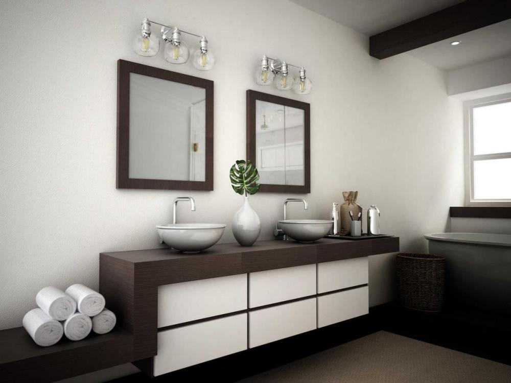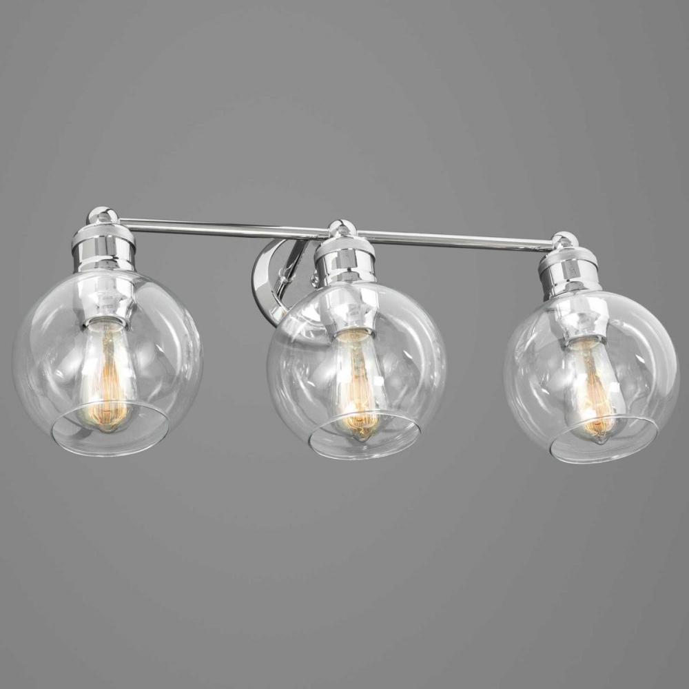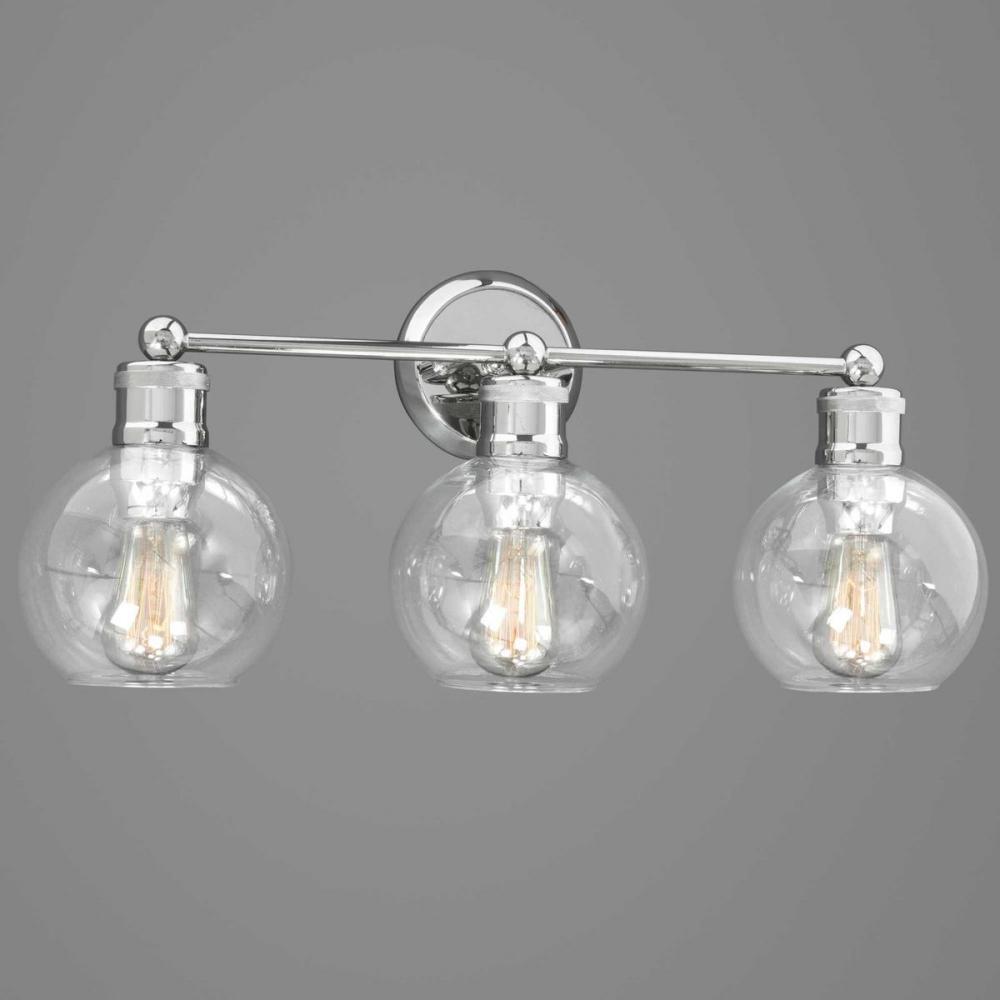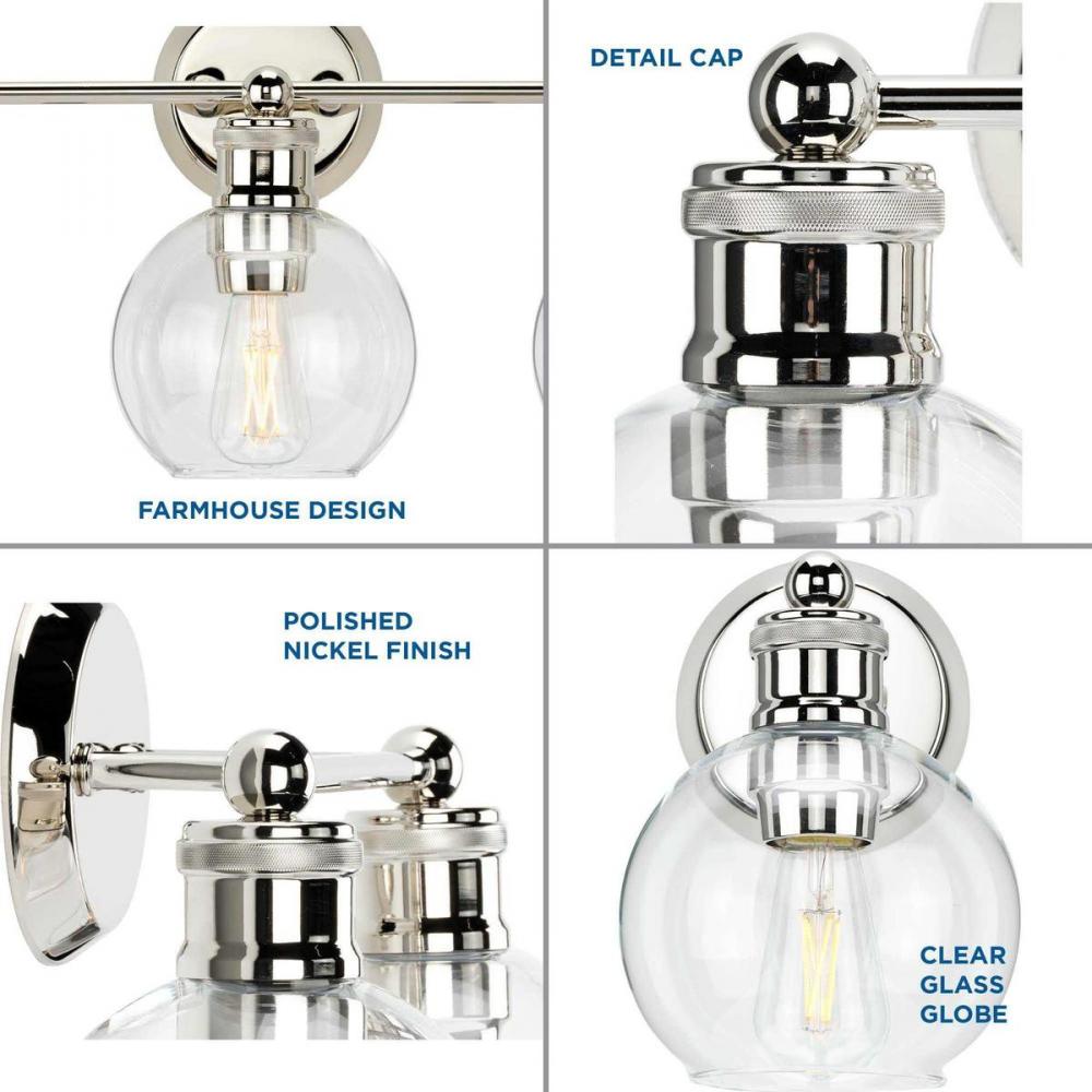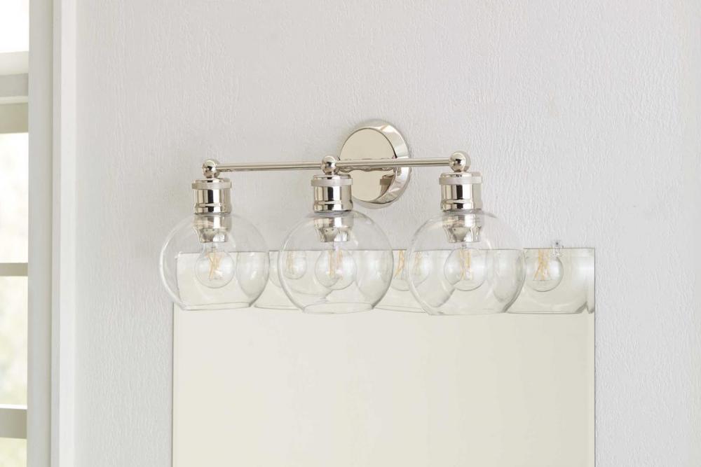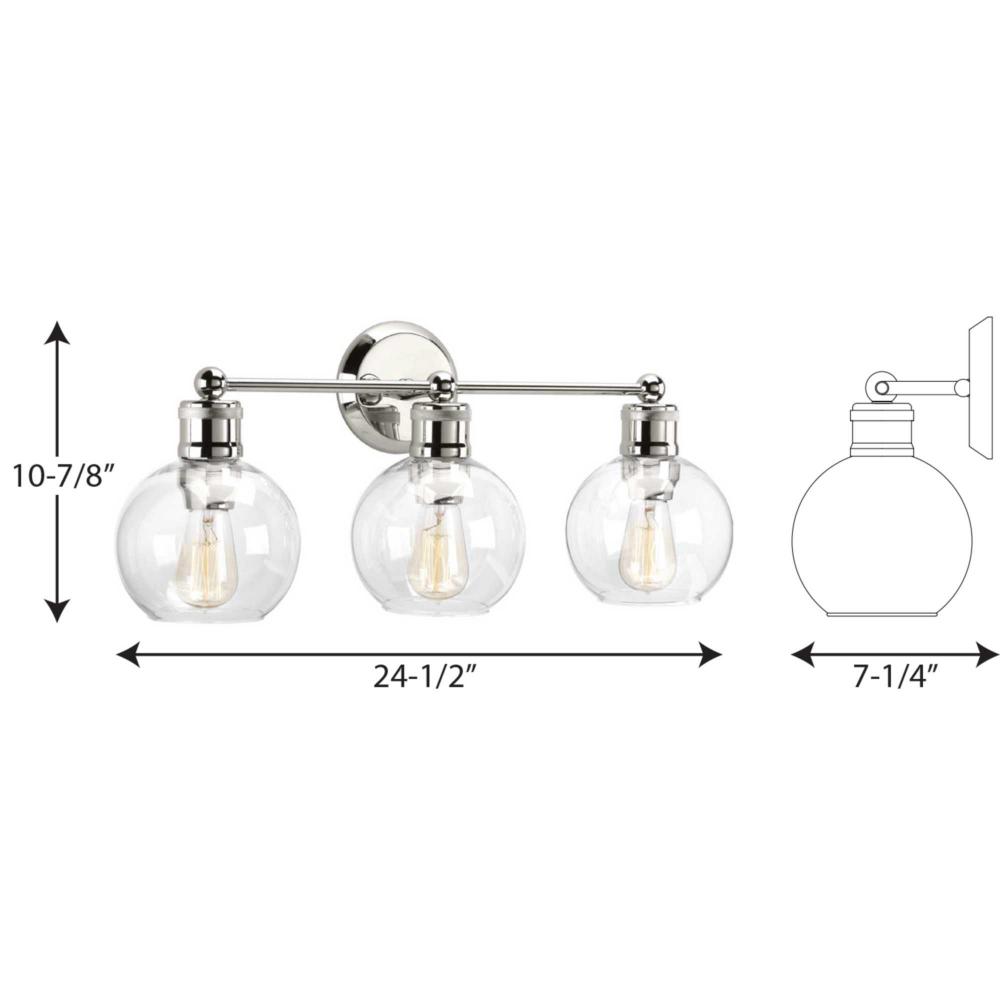 Ideal for a bathroom;Perfect for coastal, farmhouse, and vintage electric style settings;Subtle polished nickel finish;Crisp clear glass shades;Mount the light fixture facing up or down;Use 3 medium base bulbs that are sold separately (100 W max - LED/CFL/