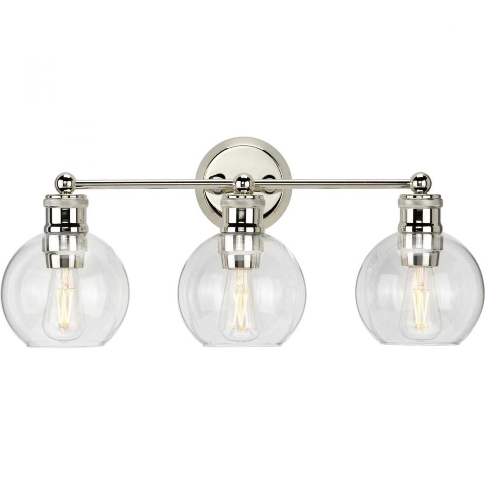 The Hansford collection of fixtures feature a clear, spherical shade paired with vintage style metal fittings in a Polished Nickel finish. Featuring a clean and precise design with generous scale, Hansford's classic style brings tranquility to your home with. Hansford lends itself to Farmhouse, Coastal or Industrial interiors. Can be used with clear or vintage bulbs for a variety of looks. The three-light bath & vanity fixture can be mounted up or down.