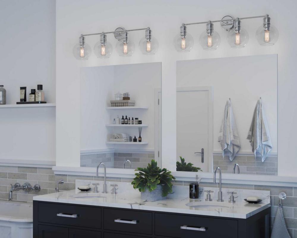 Ideal for a bathroom;Perfect for coastal, farmhouse, and vintage electric style settings;Subtle polished nickel finish;Crisp clear glass shades;Mount the light fixture facing up or down;Use 4 medium base bulbs that are sold separately (100 W max - LED/CFL/