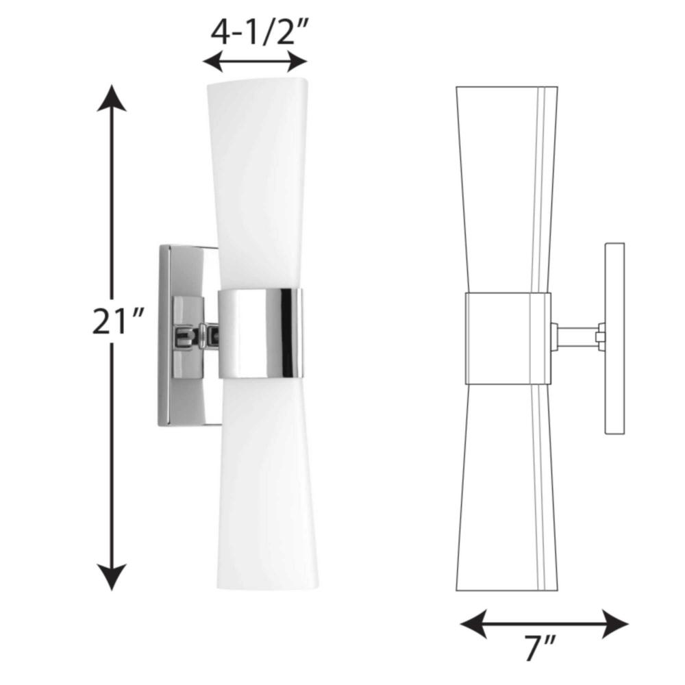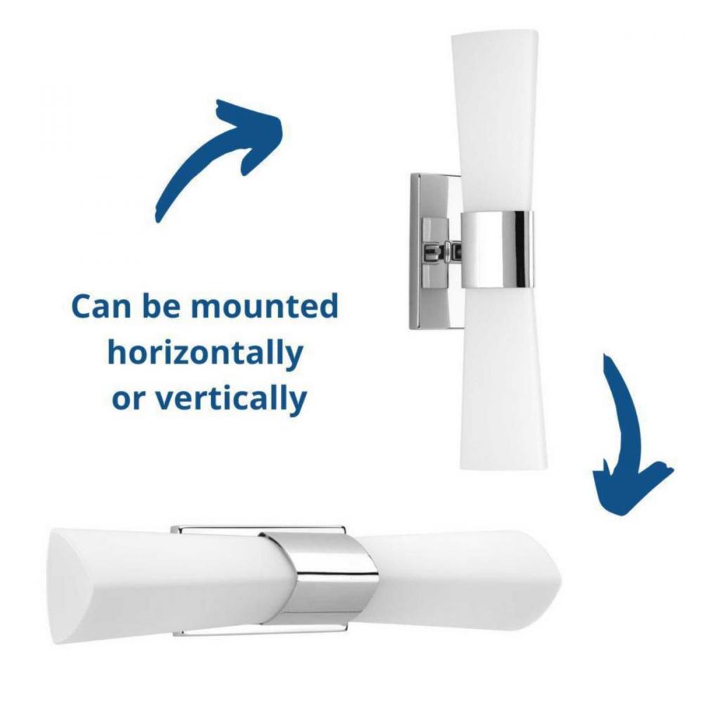 Ideal for a bathroom;Perfect for modern and transitional style settings;Crisp polished chrome finish;Elegant etched opal glass shades;Fixture can mount horizontal and vertical;Use 2 medium base bulbs that are sold separately (100 W max - LED/CFL/incandesce