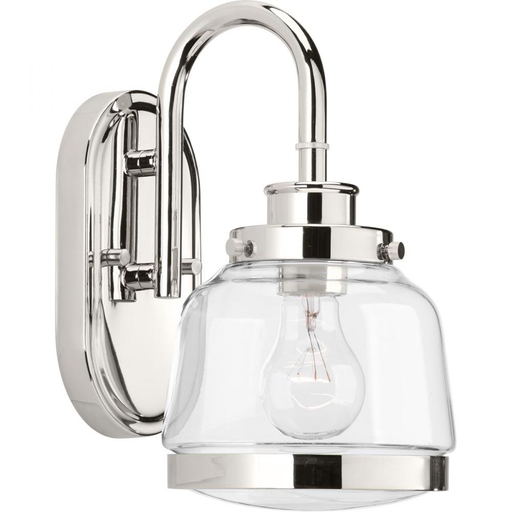 The Judson collection features a timeless clear schoolhouse-style globe. Metal fittings add distinction to complete the vintage look. Judson provides the perfect compliment to farmhouse or coastal-inspired homes. One-light bath & vanity in a Polished Nickel finish.