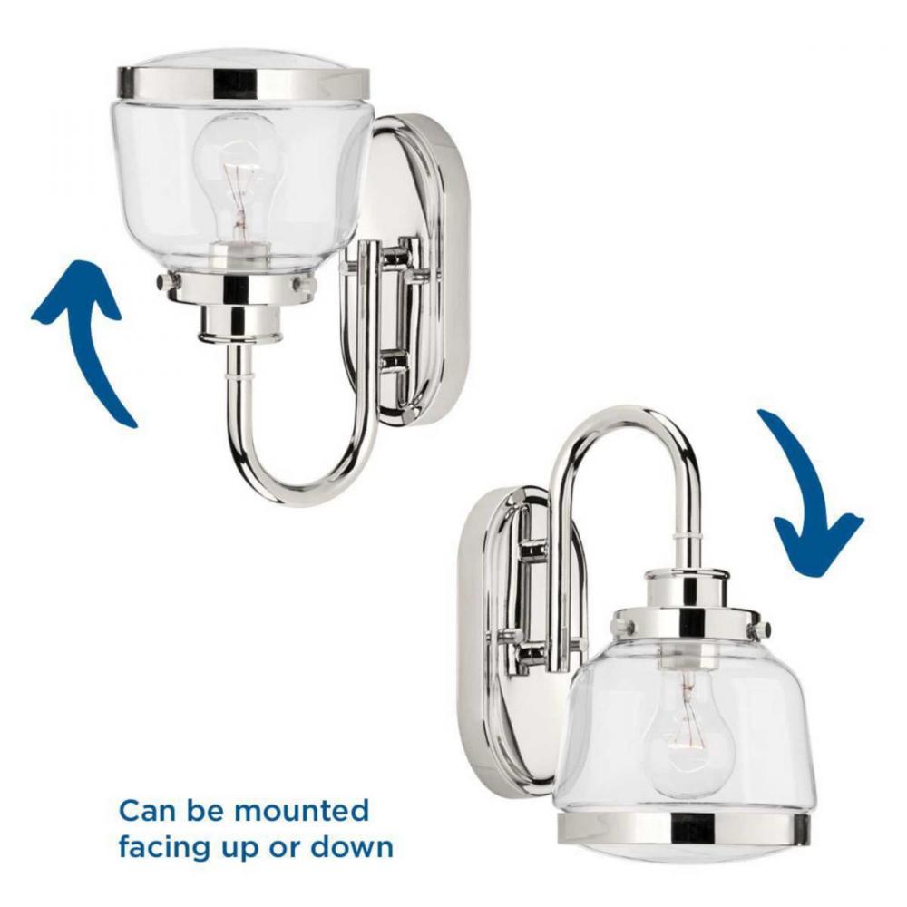 Ideal for a bathroom, dining room, hallway, or foyer;Perfect for farmhouse and vintage electric style settings;Subtle polished nickel finish;Crisp clear glass shade;Mount the light fixture facing up or down;Use 1 medium base bulb that is sold separately (7